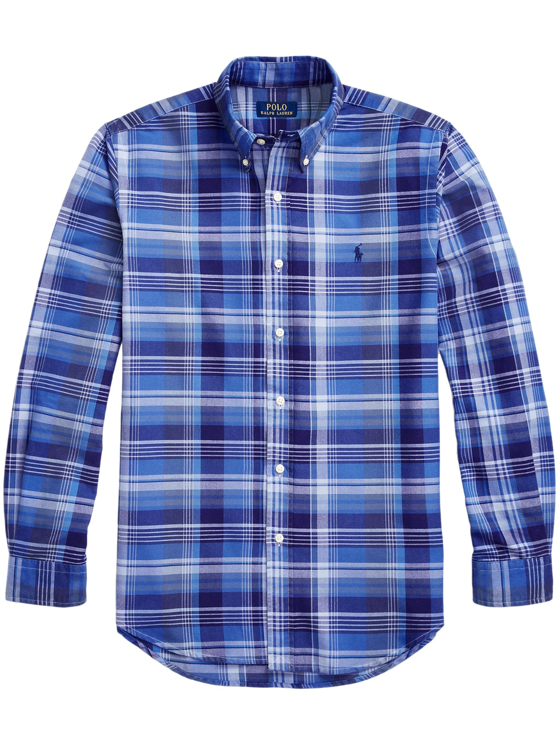 oxford blue/multicolour cotton plaid check print embroidered logo at the chest signature Polo Pony motif button-down collar front button fastening shirt sleeves buttoned cuffs curved hem