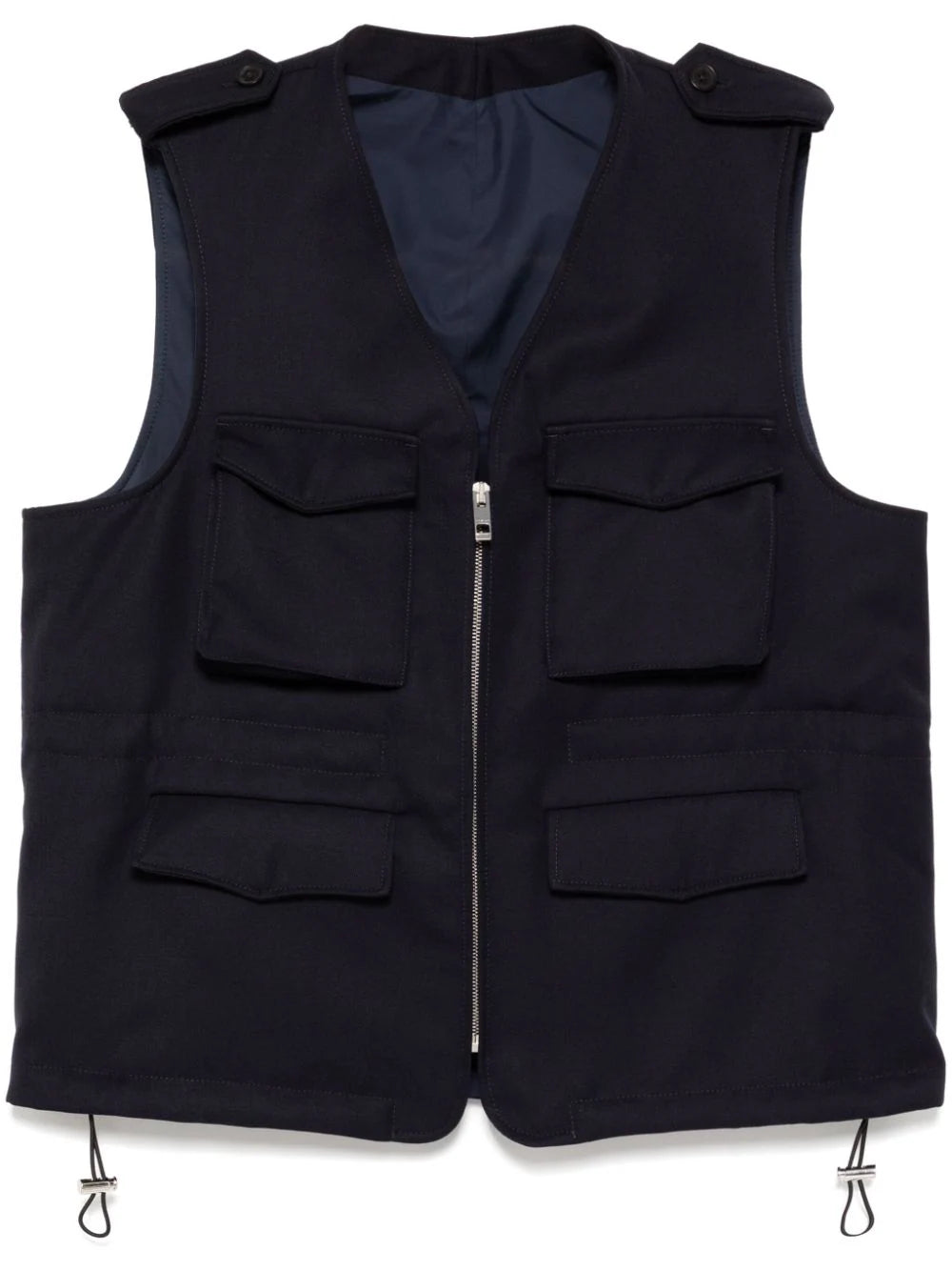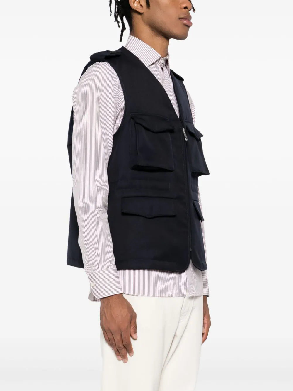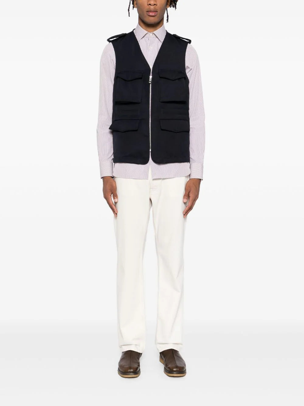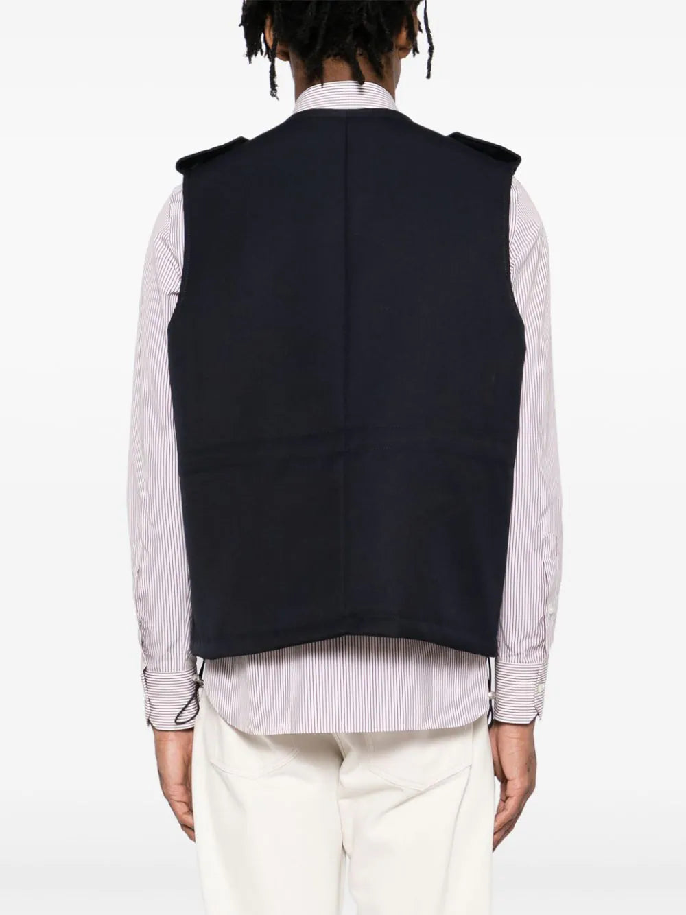 Elevate your style with our Padded Gilet. This navy blue masterpiece boasts a front zip fastening, two button-fastening shoulder straps, and two button-fastening chest pockets for a tailored fit. With added convenience of two front flap pockets and an elasticated hem, this sleeveless gilet is the perfect combination of function and fashion. Complete with a full lining, it's the ultimate choice for luxurious layering.