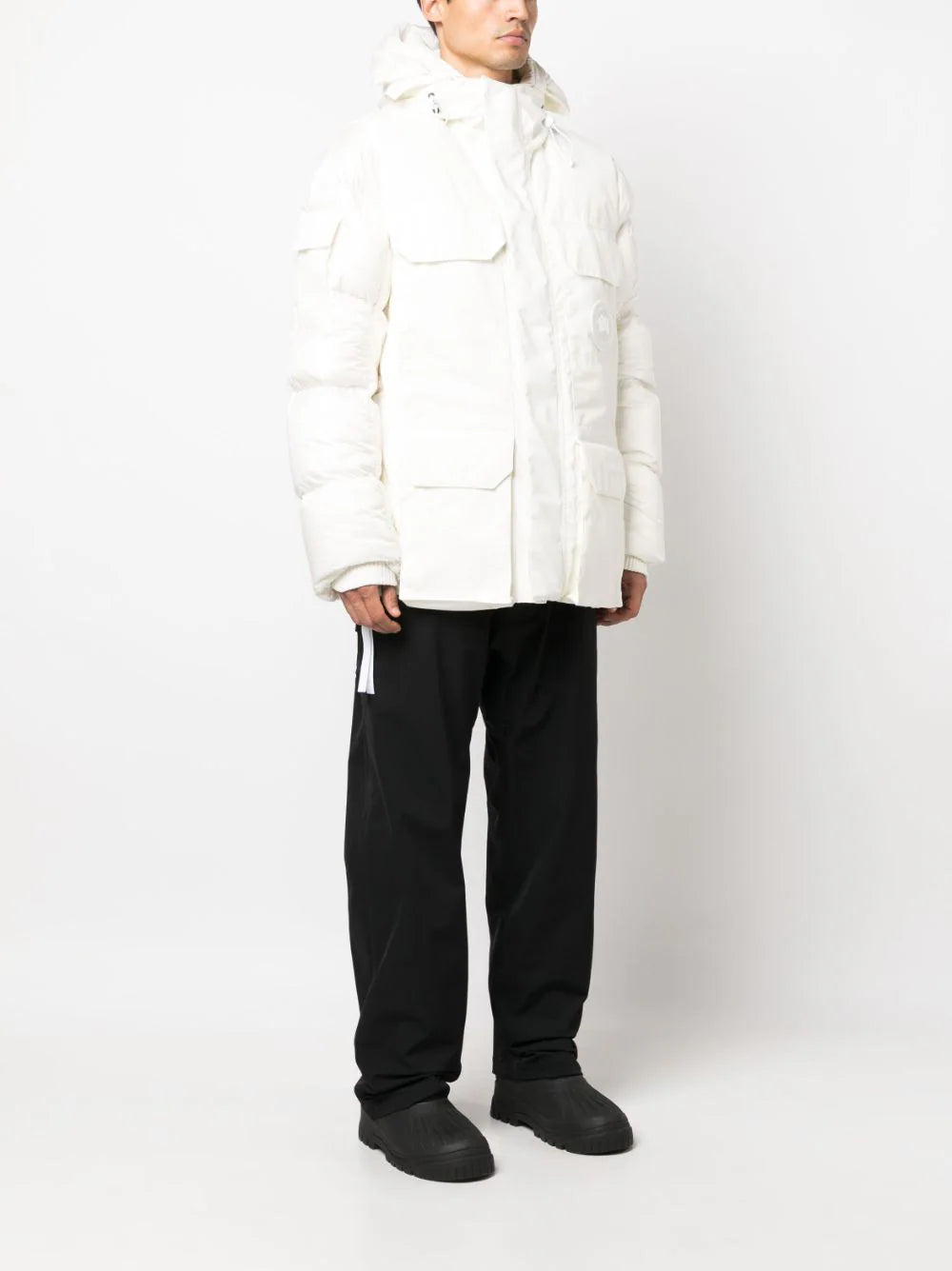 Paradigm Expedition hooded padded jacket from CANADA GOOSE featuring white, duck down, padded design, ribbed cuffs, logo patch to the front, classic hood, concealed front fastening, long sleeves, logo shoulder strap, two chest flap pockets, two front flap pockets and straight hem.