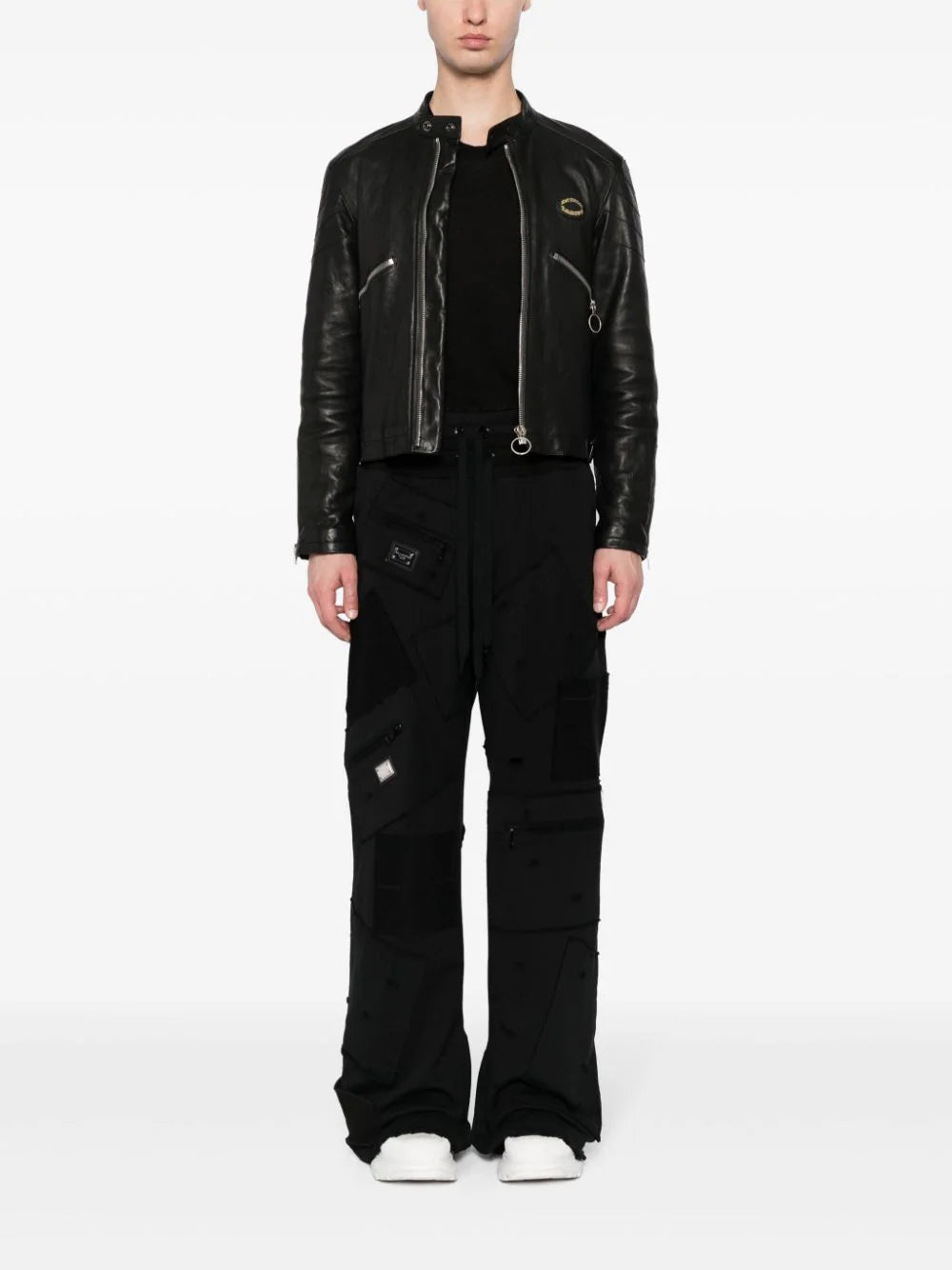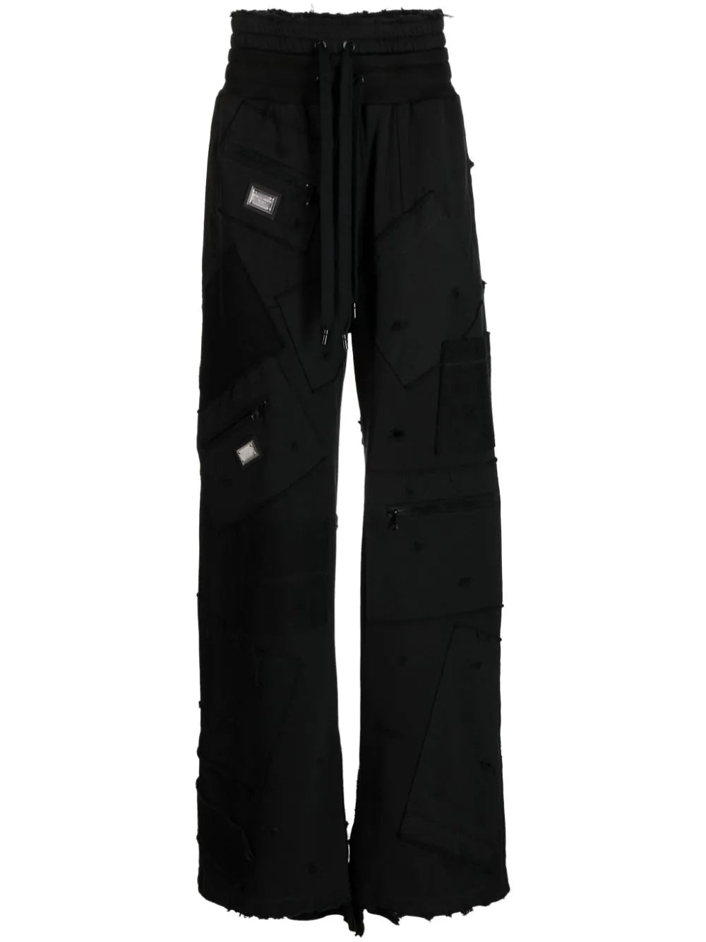 black stretch-cotton jersey texture patchwork design silver-tone logo plaque high-waisted wide leg elasticated drawstring waistband front zip fastening pockets