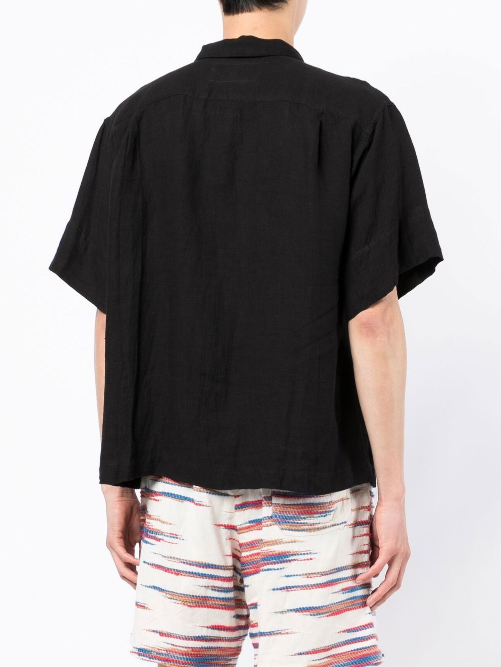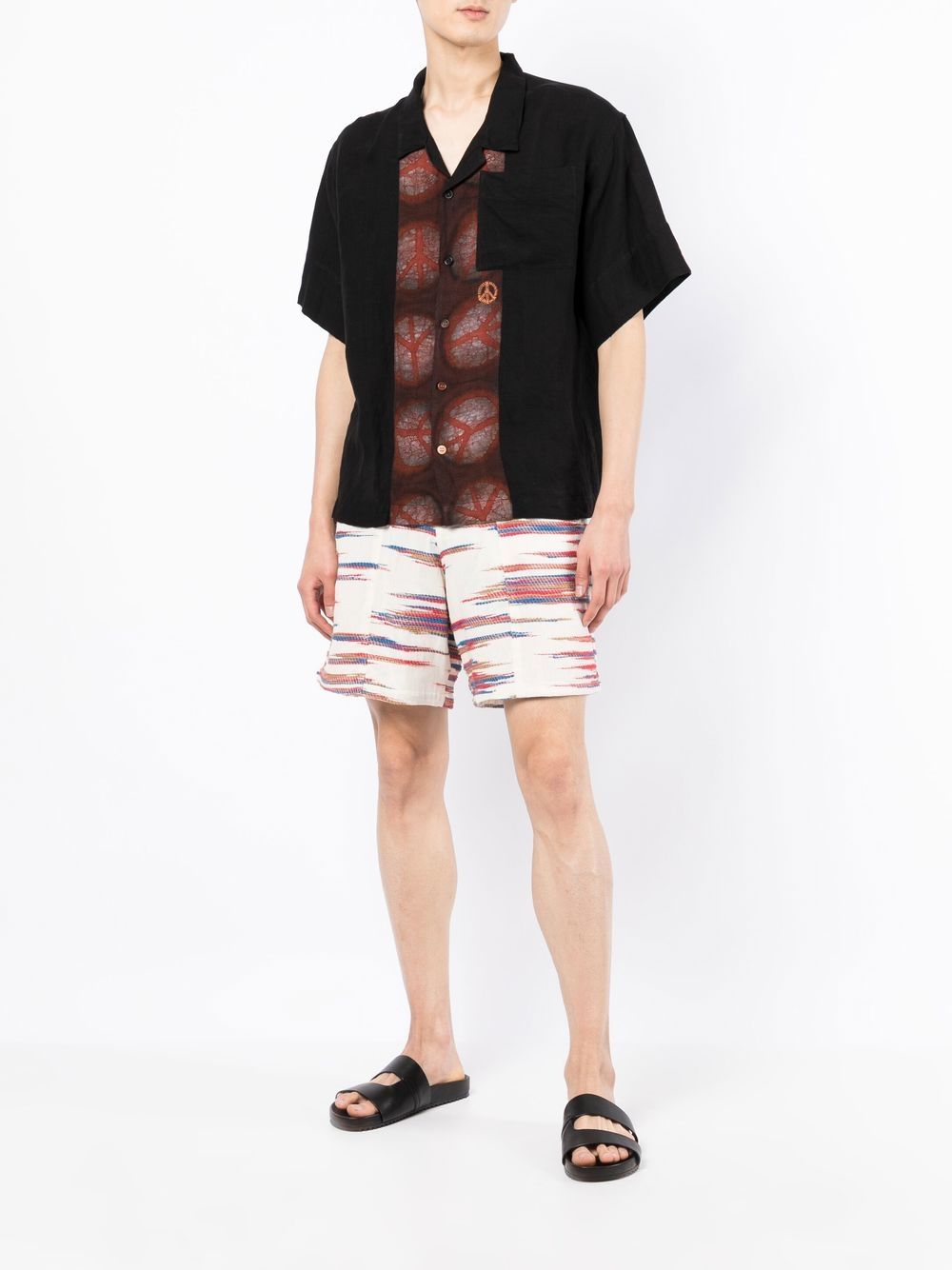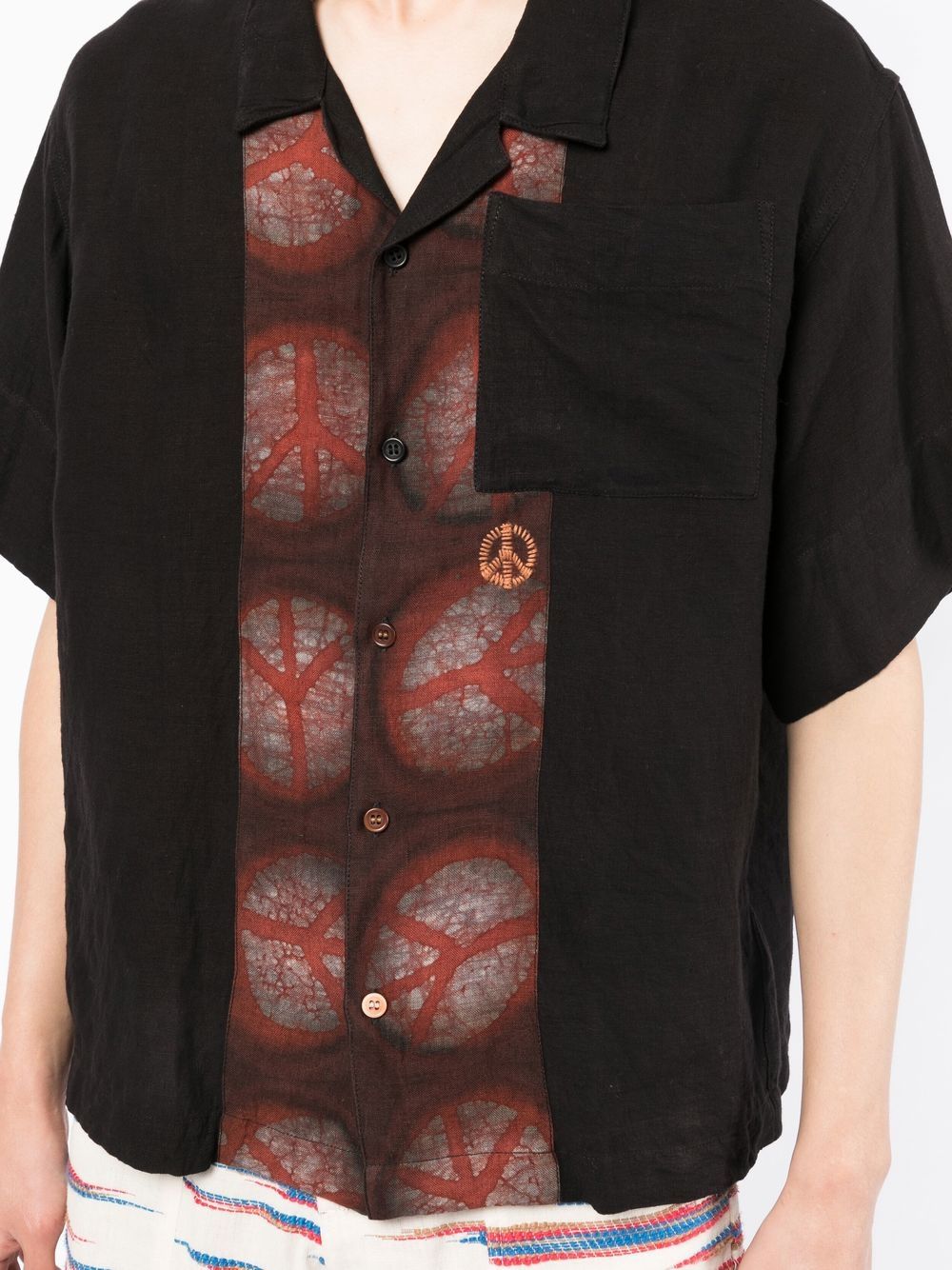 Peace Greetings linen shirt from STORY mfg. featuring black, linen, graphic print at the chest, classic collar, short sleeves and front button placket.