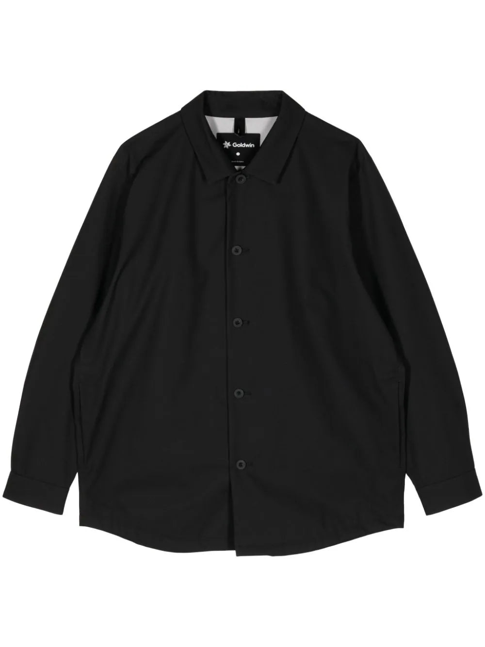 jet black waterproof logo-engraved buttons classic collar front button fastening long raglan sleeves buttoned cuffs curved hem