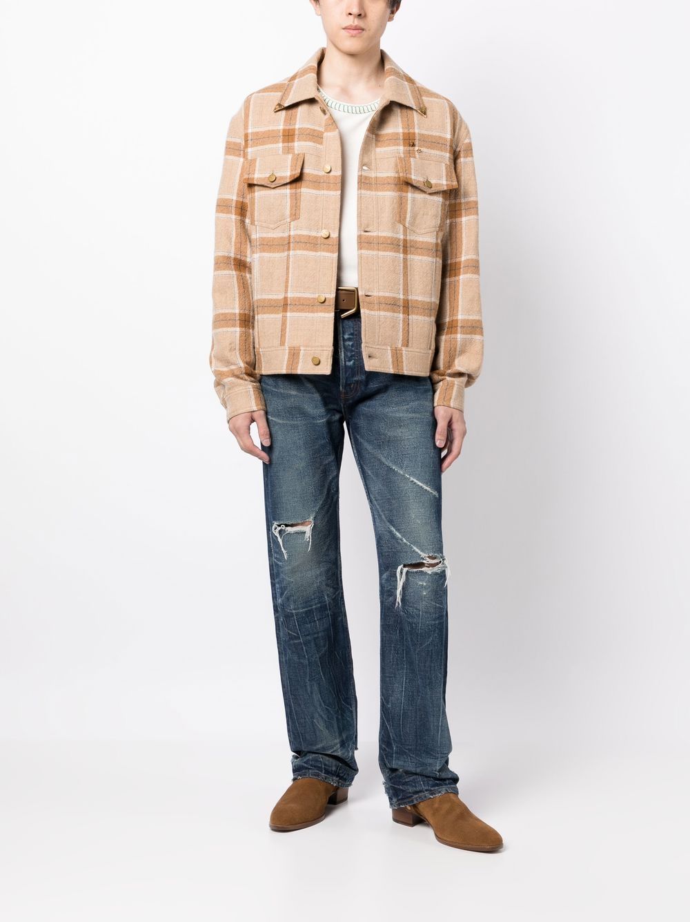 plaid-check print shirt jacket from NICK FOUQUET featuring two chest flap pockets, camel brown, virgin wool, plaid-check print, classic collar, front button fastening and long sleeves.