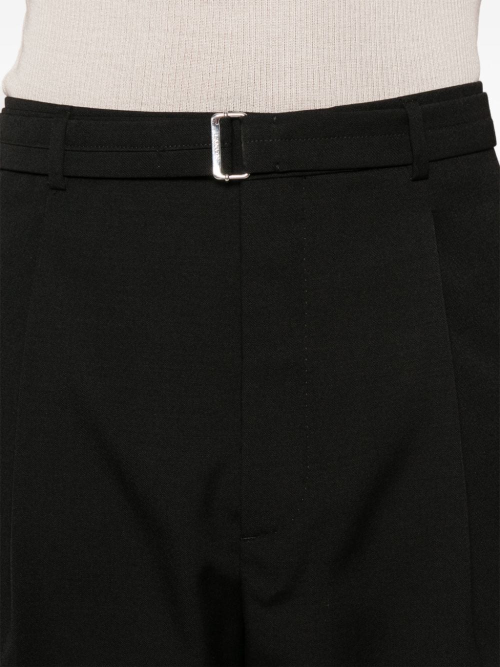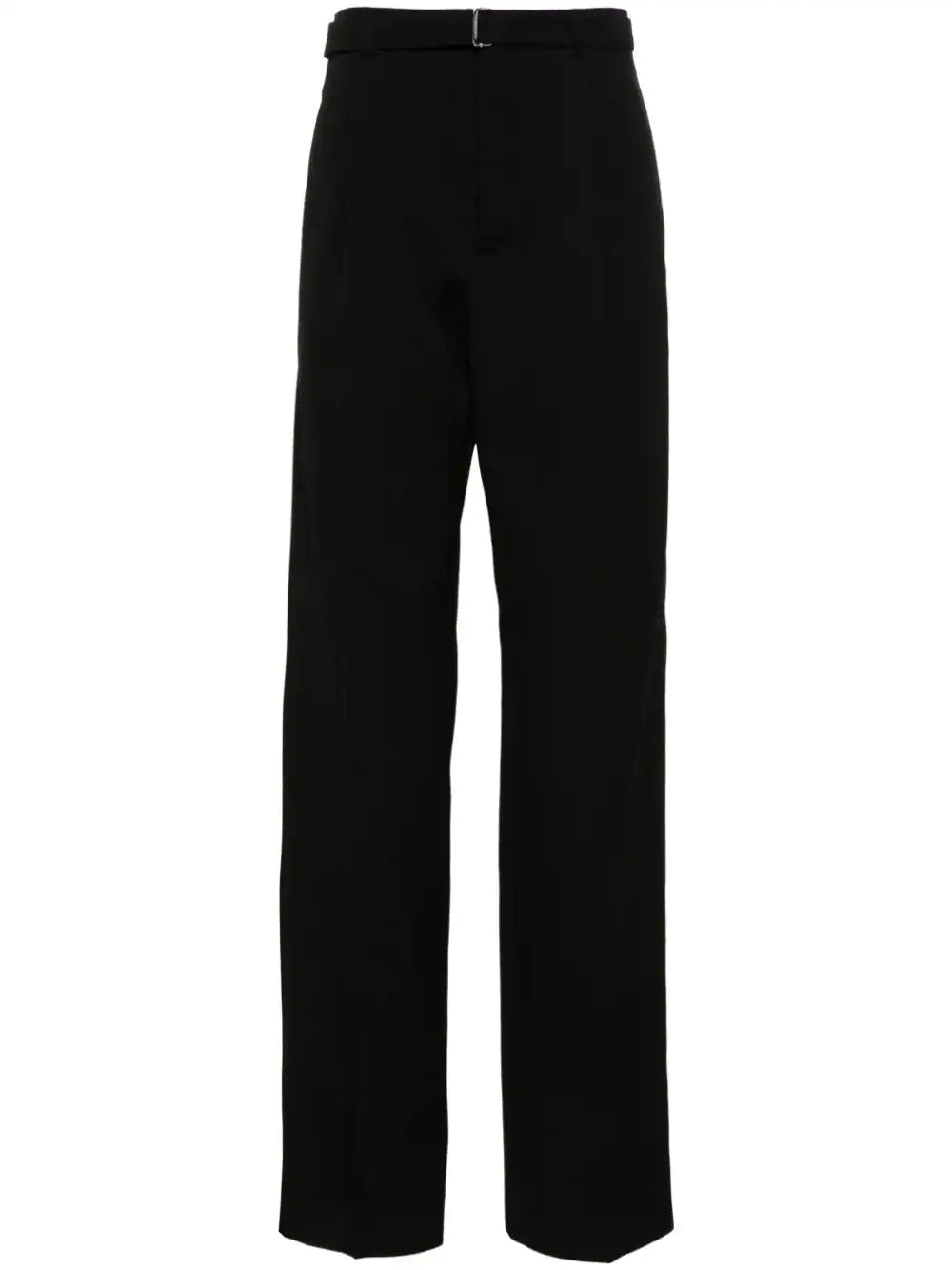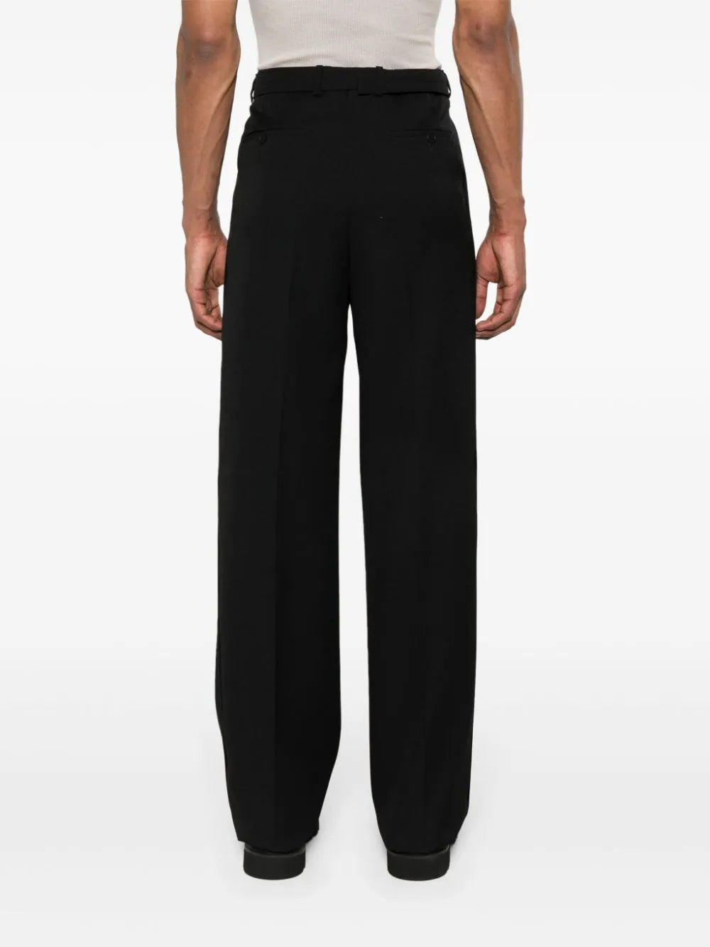 black wool twill weave pleat detailing pressed crease detachable belt belt loops two side inset pockets two rear button-fastening jetted pockets concealed front button, hook and zip fastening