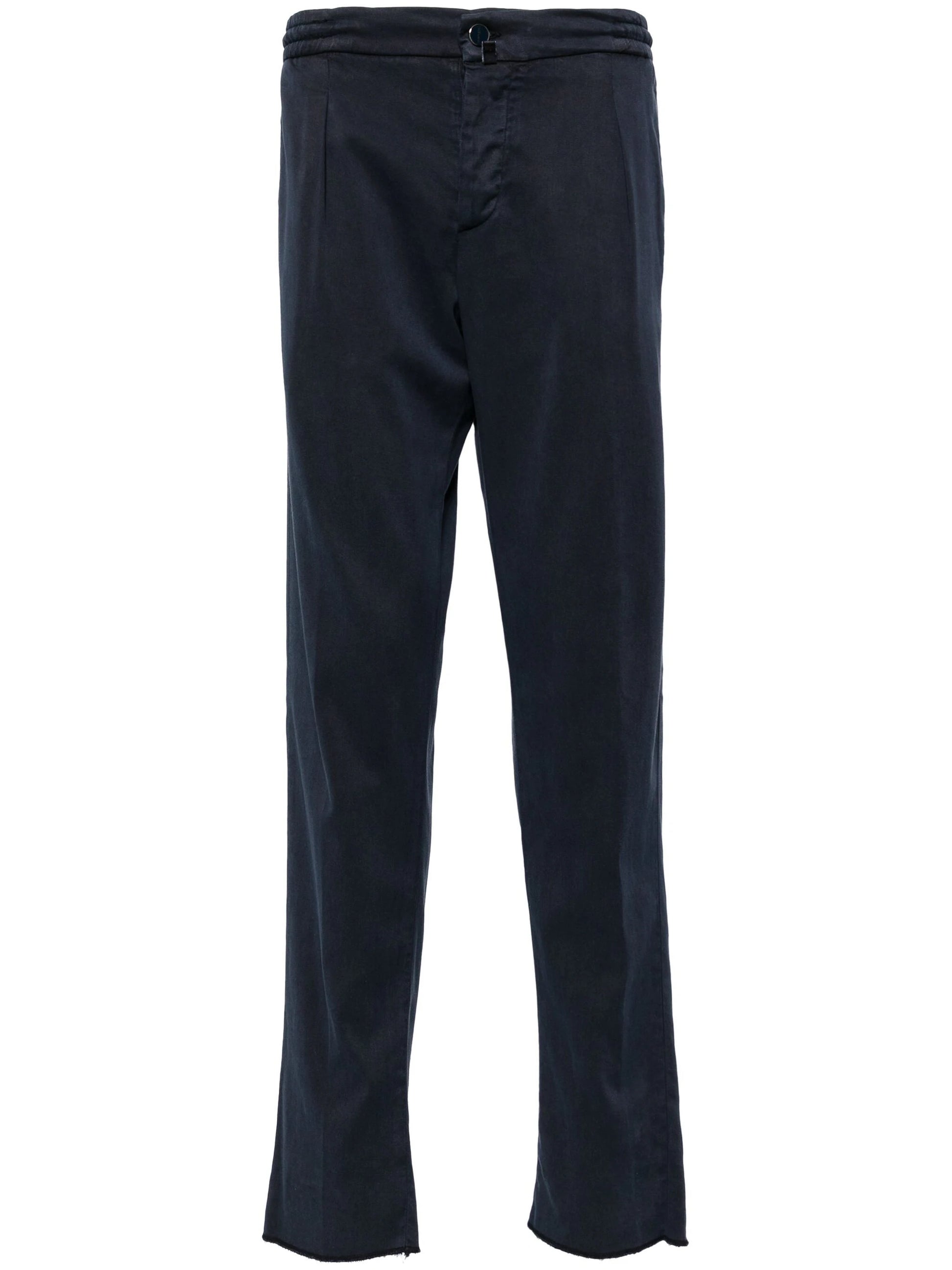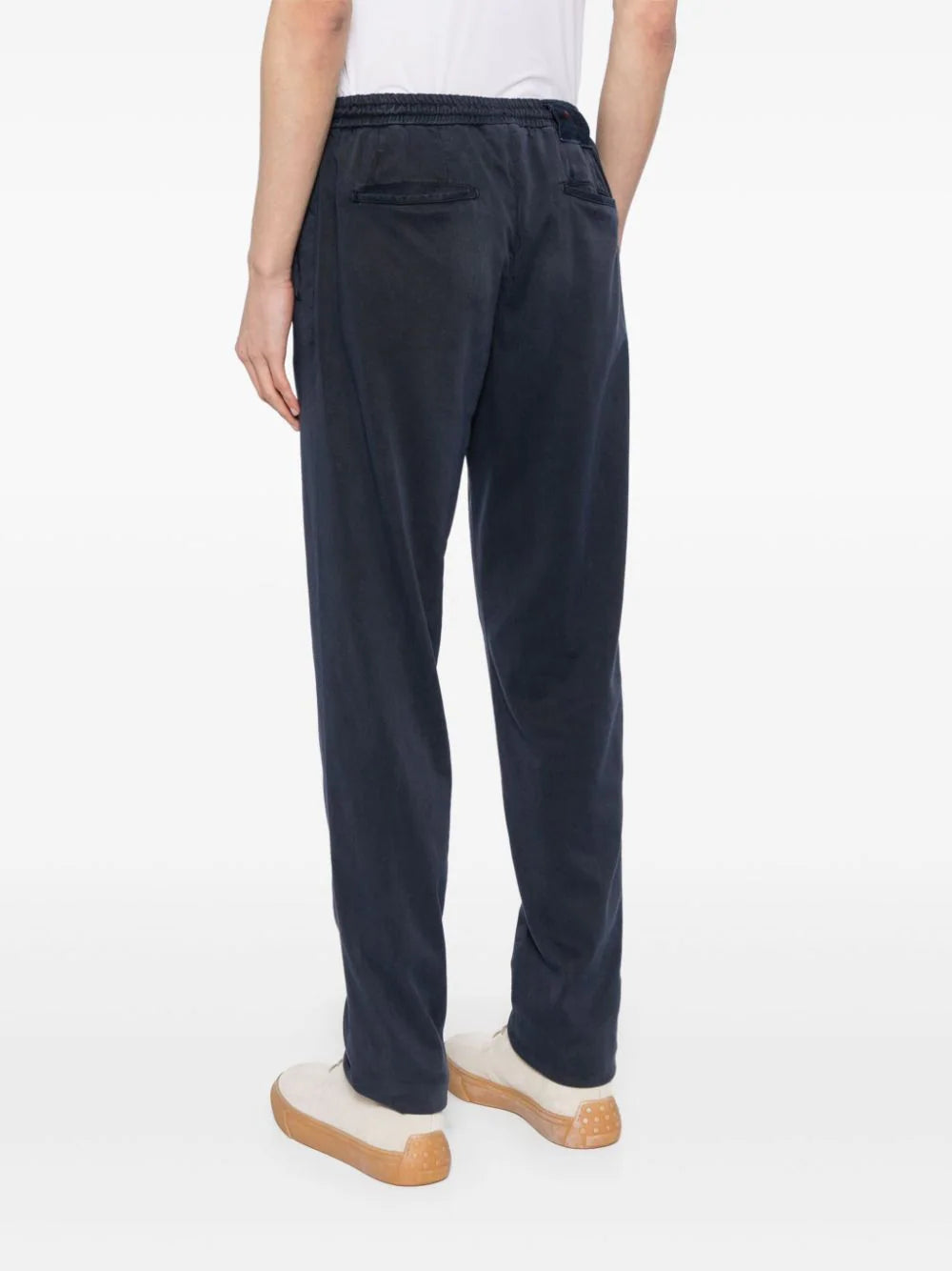 navy blue lyocell blend cotton lining stretch-design mini logo tag logo patch to the rear front button fastening elasticated waistband tapered leg two rear jetted pockets