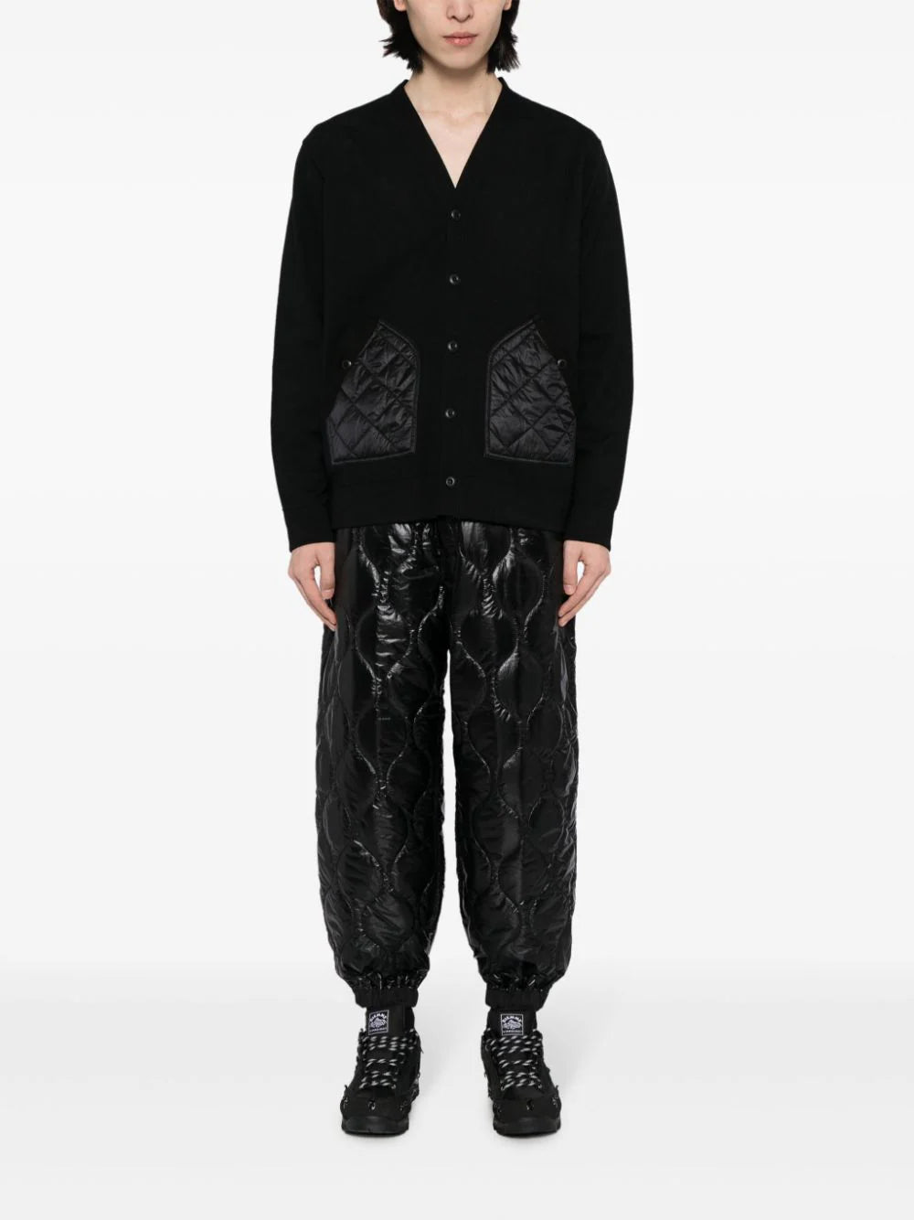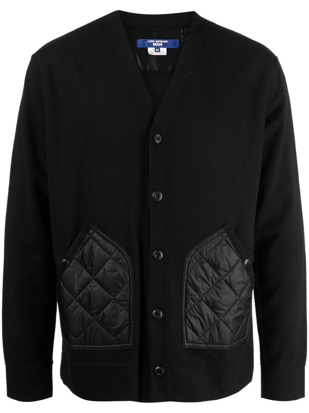 black V-neck long sleeves front button fastening two quilted pockets at the sides straight hem