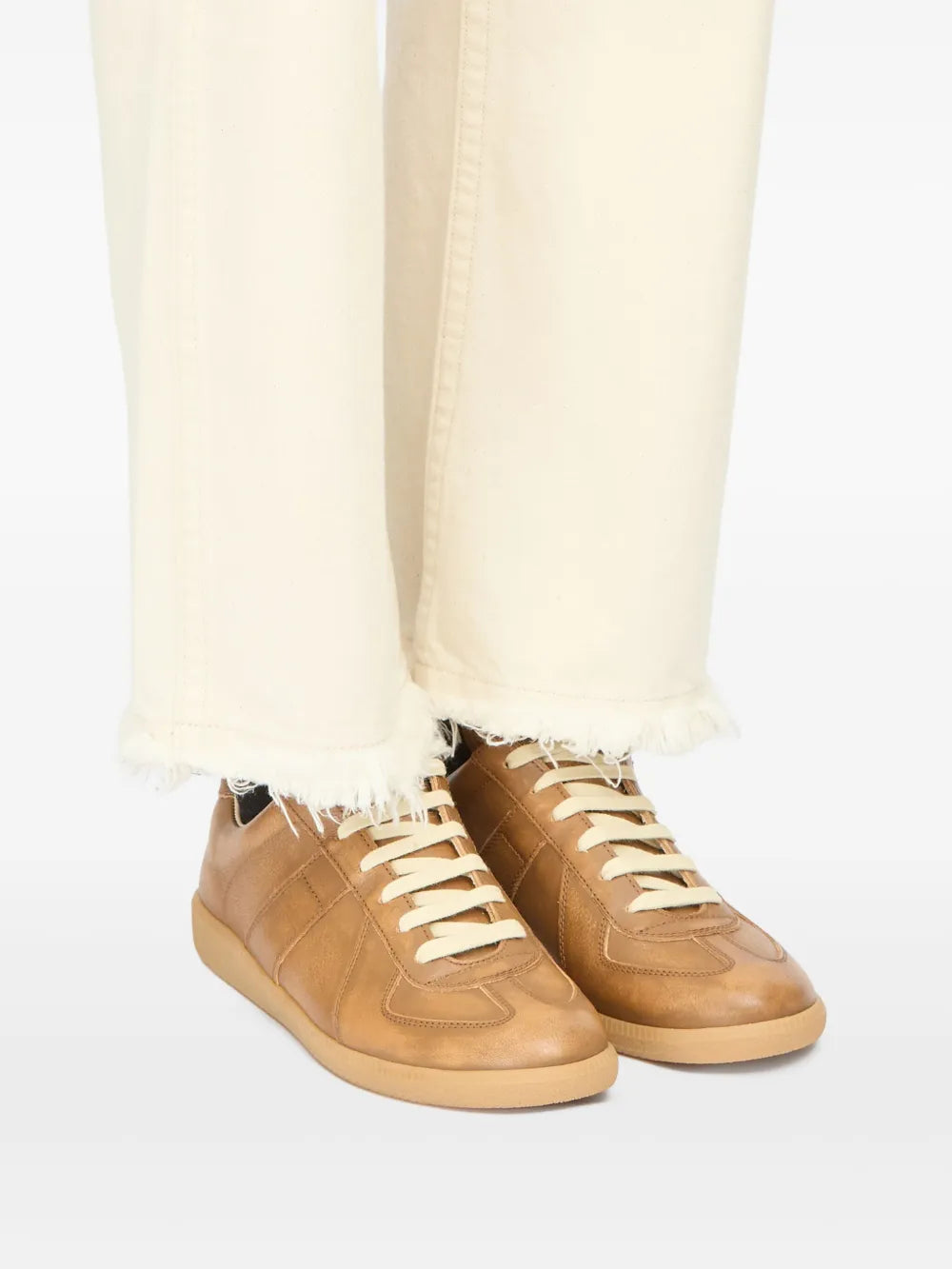 Expertly crafted from luxurious cognac brown leather, our Replica Panelled Sneakers exude both style and comfort. Featuring a signature single-stitch logo, front lace-up fastening, and an almond toe design, these sneakers are perfect for any casual or athletic outfit. With a flat rubber sole, you can confidently walk or run with ease. Upgrade your shoe game with these must-have sneakers.