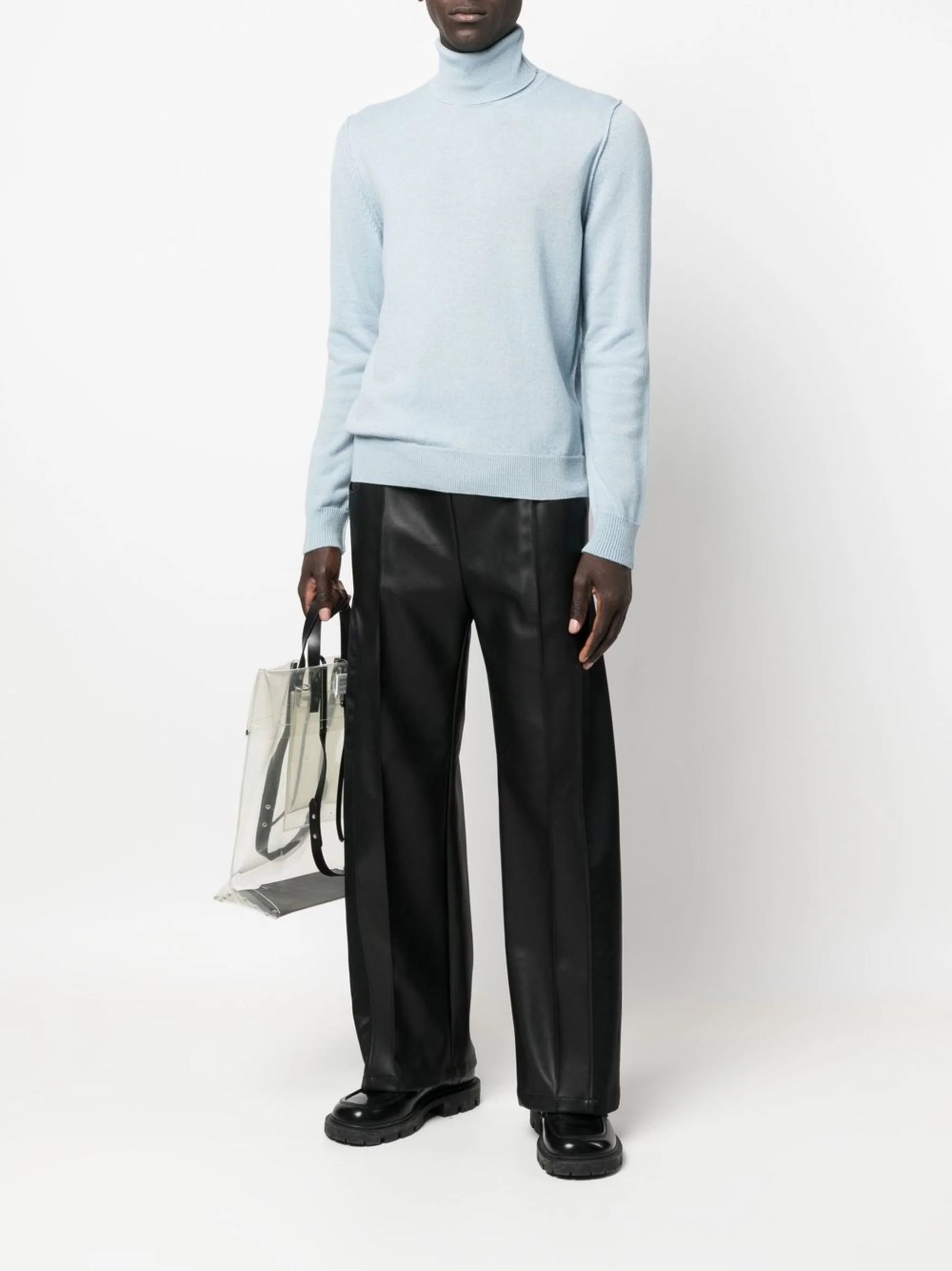 roll-neck cashmere jumper from Maison Margiela featuring light blue, cashmere, knitted construction, roll neck, long sleeves, fitted-cuff sleeves and straight hem.