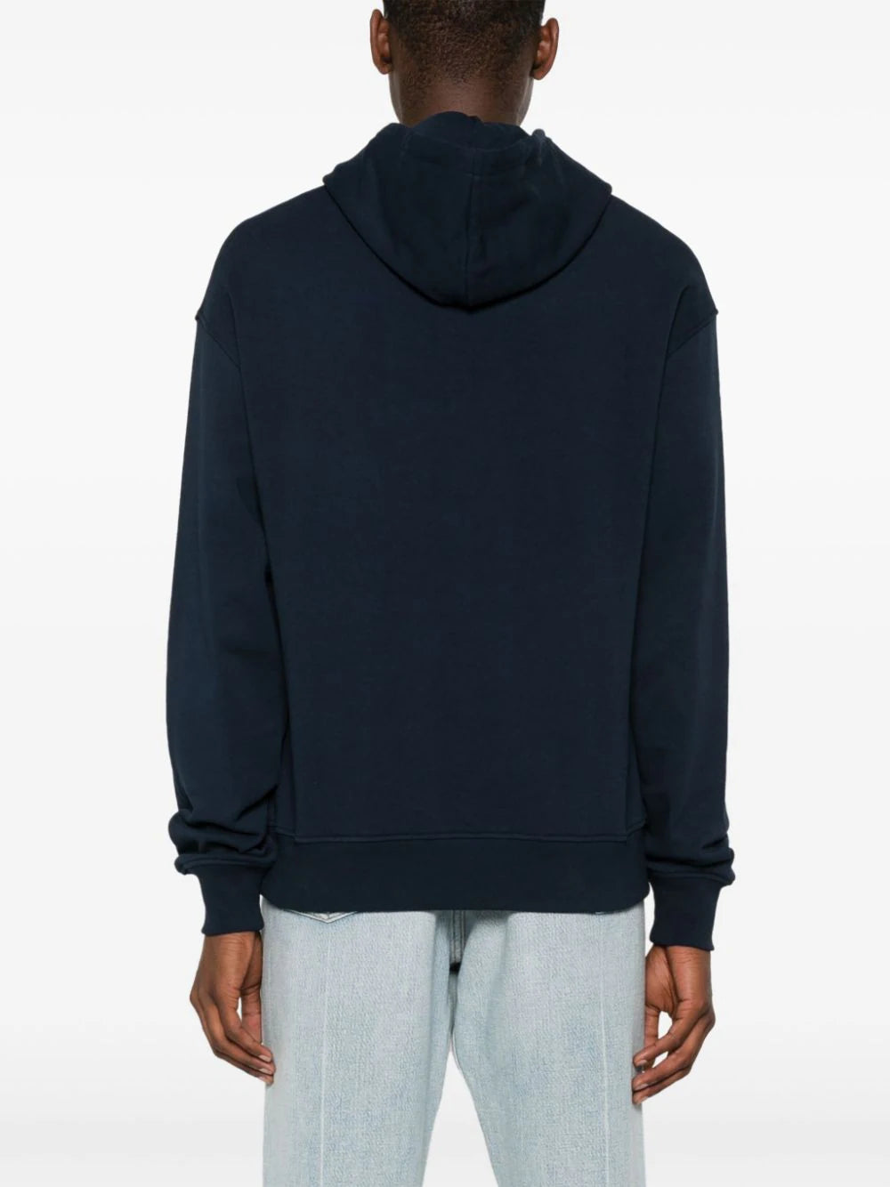 navy blue cotton jersey texture drawstring hood drop shoulder long sleeves logo patch at the sleeve ribbed cuffs and hem Running Dog print at the chest front pouch pocket logo print to the rear straight hem