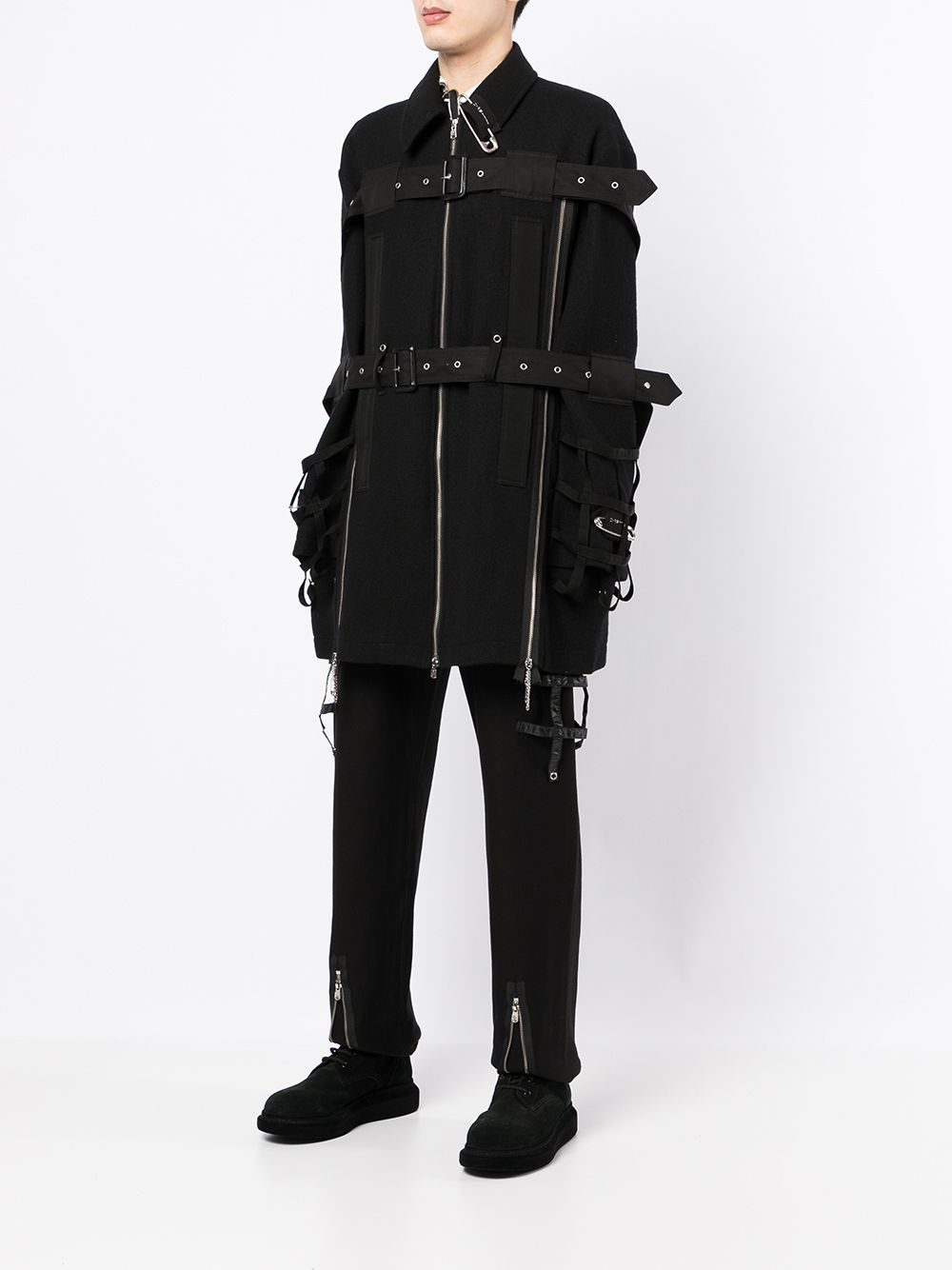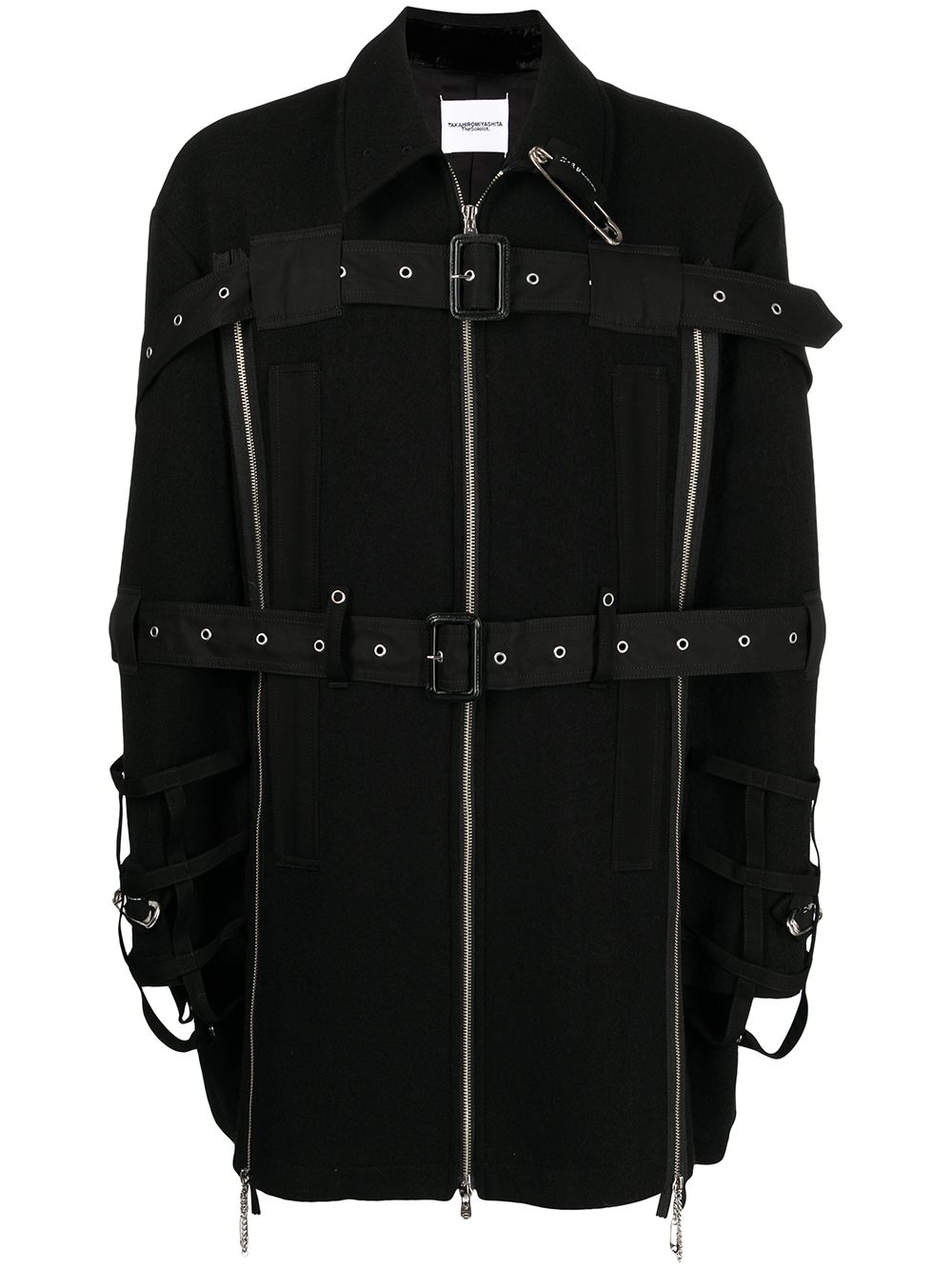 Black wool safety-pin detail jacket from TAKAHIROMIYASHITA The SoloIst featuring decorative buckle detailing, zip details, front zip fastening, long sleeves, safety pin detail and classic collar.