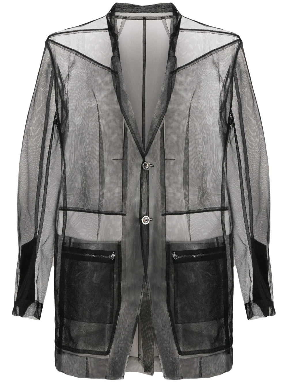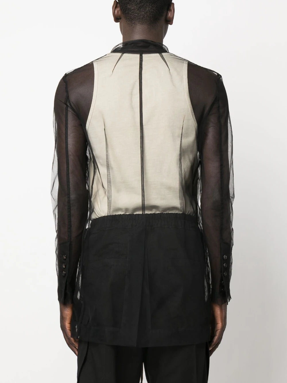 sheer buttoned shirt from Rick Owens featuring black, semi-sheer construction, vertical seamed, collarless, front button fastening, long sheer sleeves, front zip fastening pockets and straight hem.