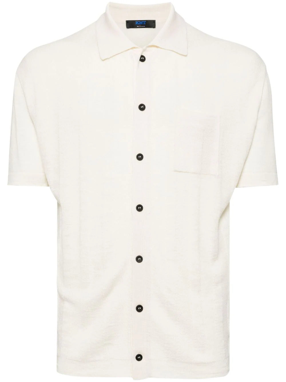 white virgin wool-silk blend fine knit spread collar front button fastening chest patch pocket short sleeves straight hem