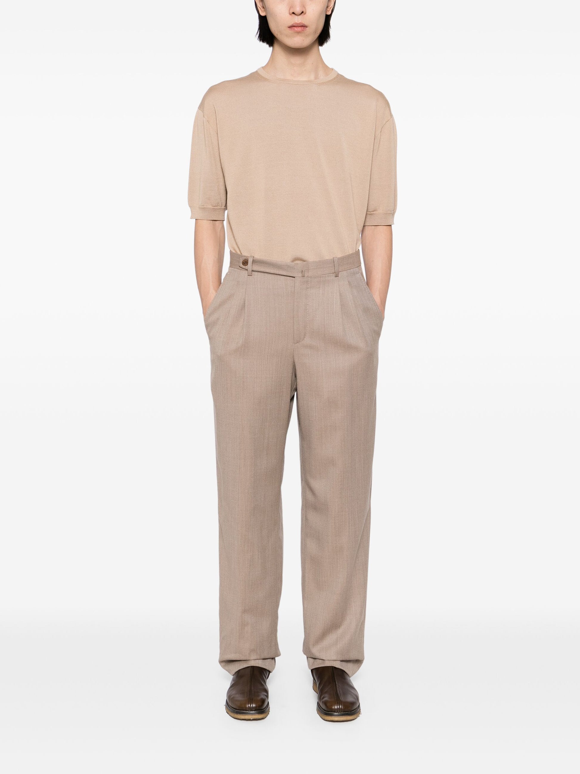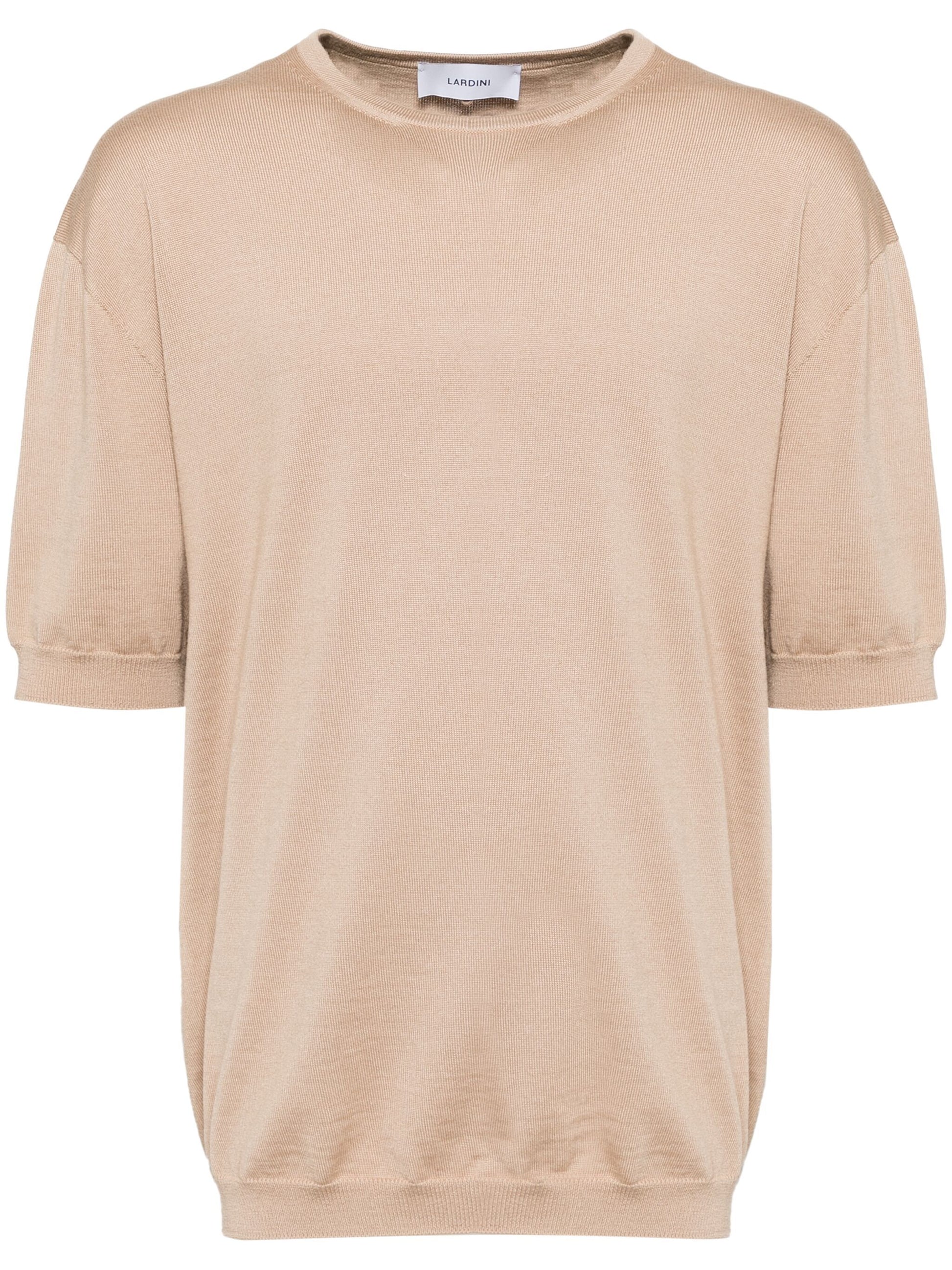 Expertly crafted from a blend of wool, this light brown short-sleeved jumper features a classic crew neck design and ribbed cuffs and hem for a snug and comfortable fit. The knitted construction provides both warmth and breathability, making this an ideal choice for cool weather.