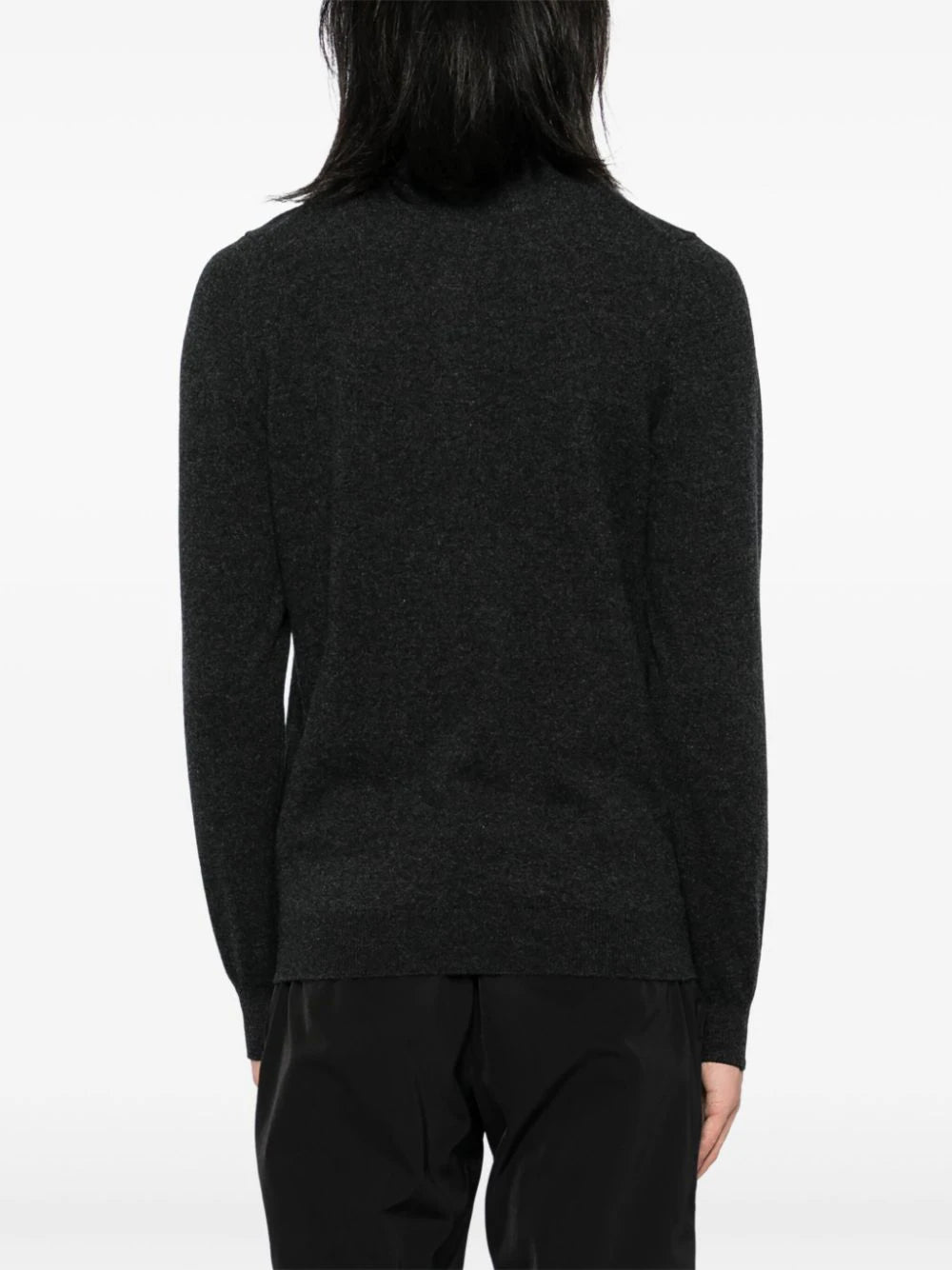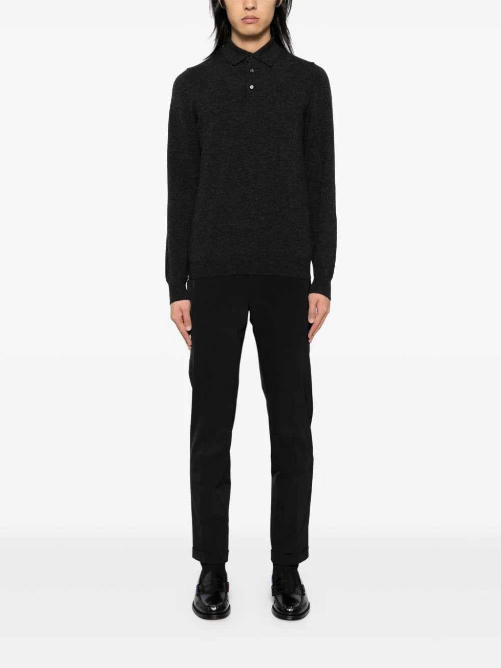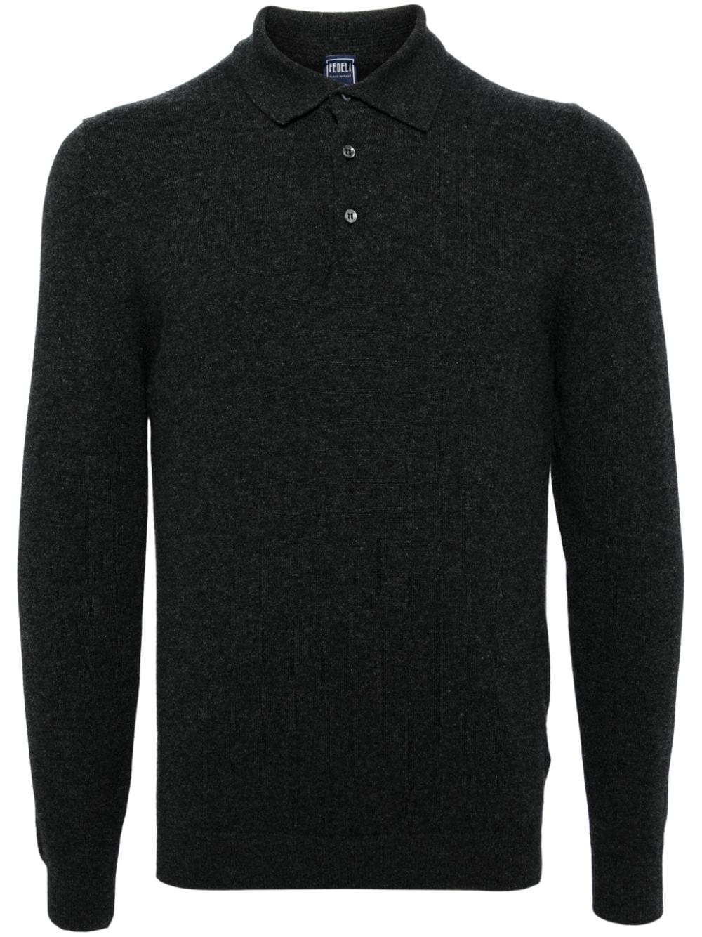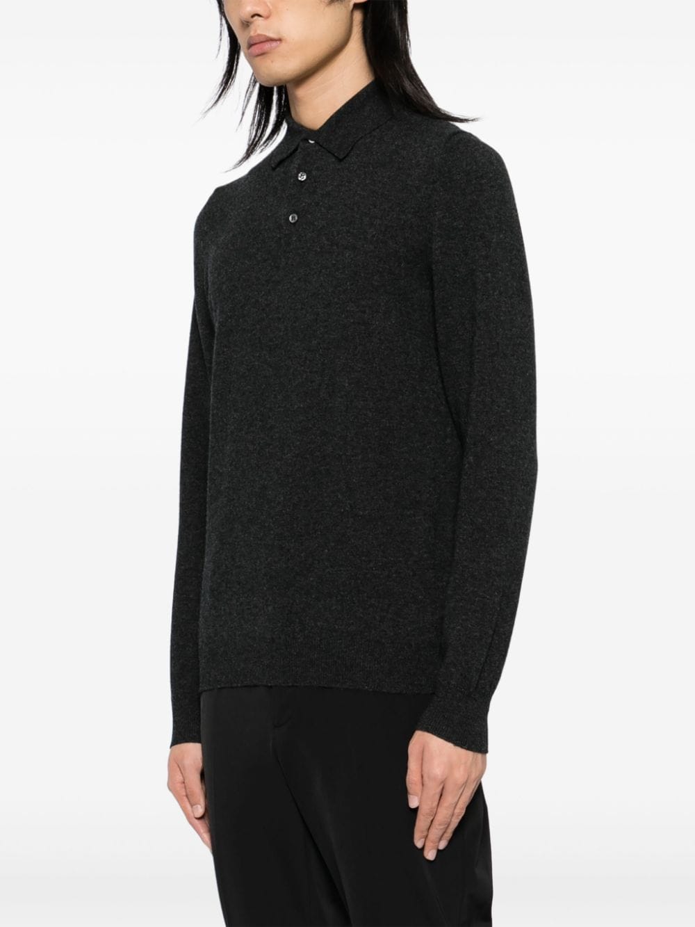 antracite grey cashmere knitted construction mélange effect polo collar front button placket long sleeves ribbed cuffs and hem