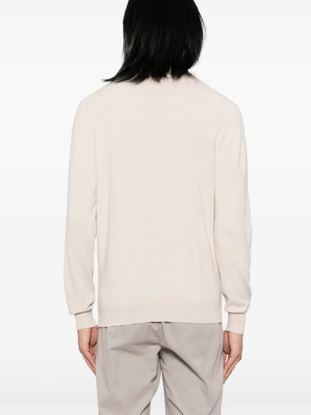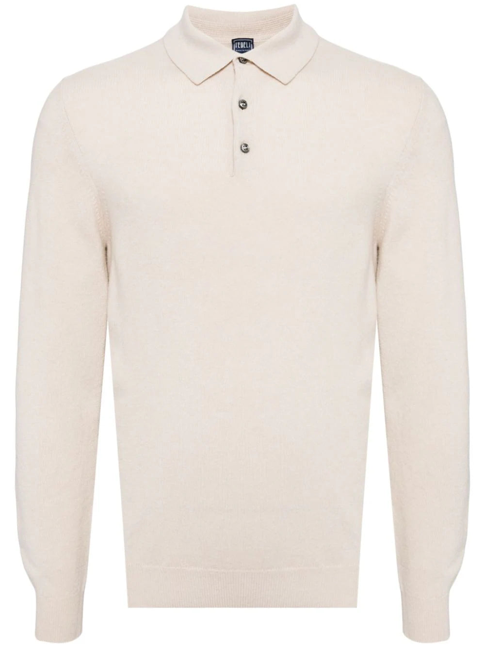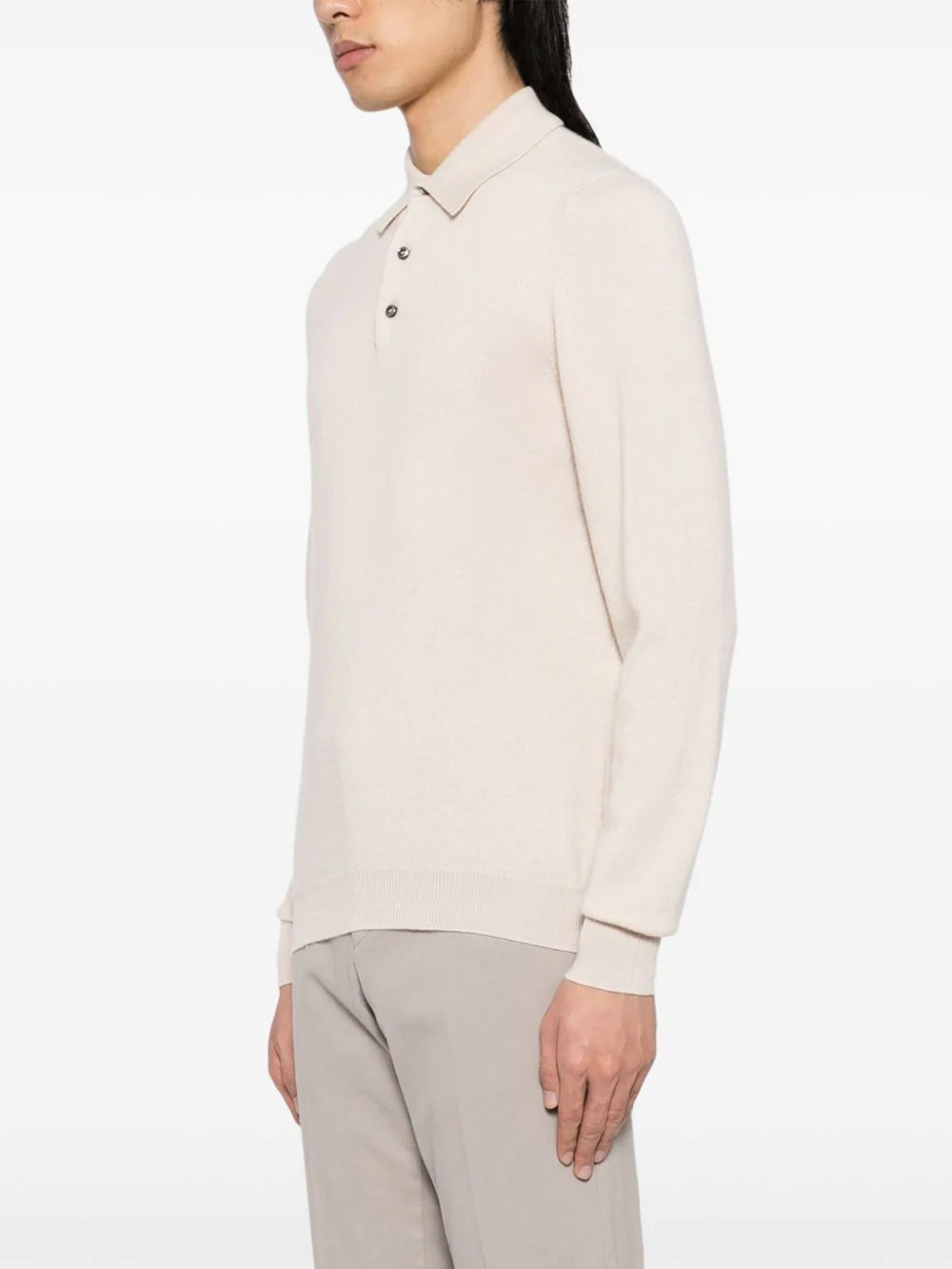 beige cashmere knitted construction front button placket polo collar long sleeves ribbed cuffs and hem