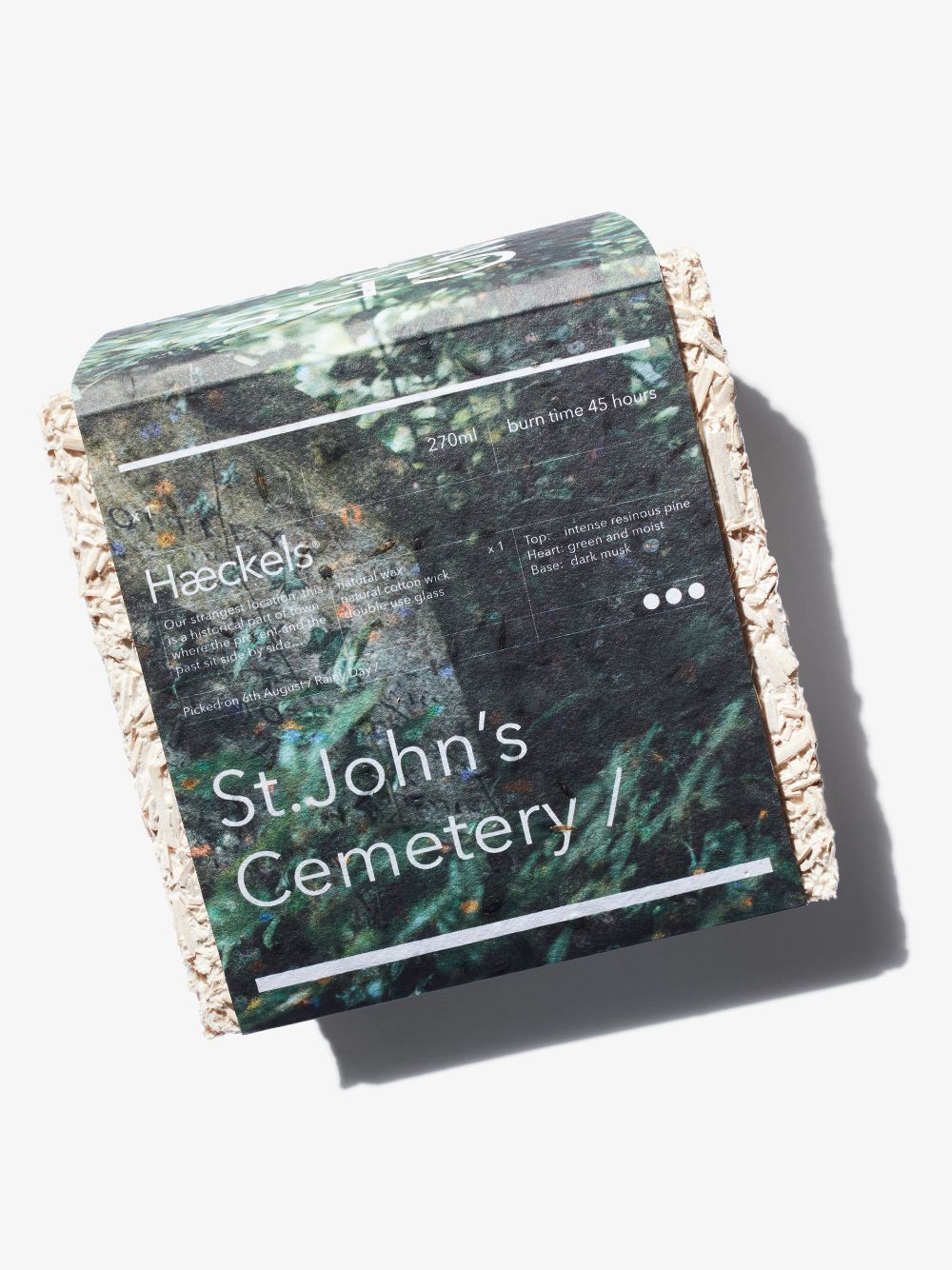 St John's Cemetery / GPS 22’ 41”E Candle from Haeckels featuring pine, moss green, musk, soy wax, glass and 40-hour burn time.