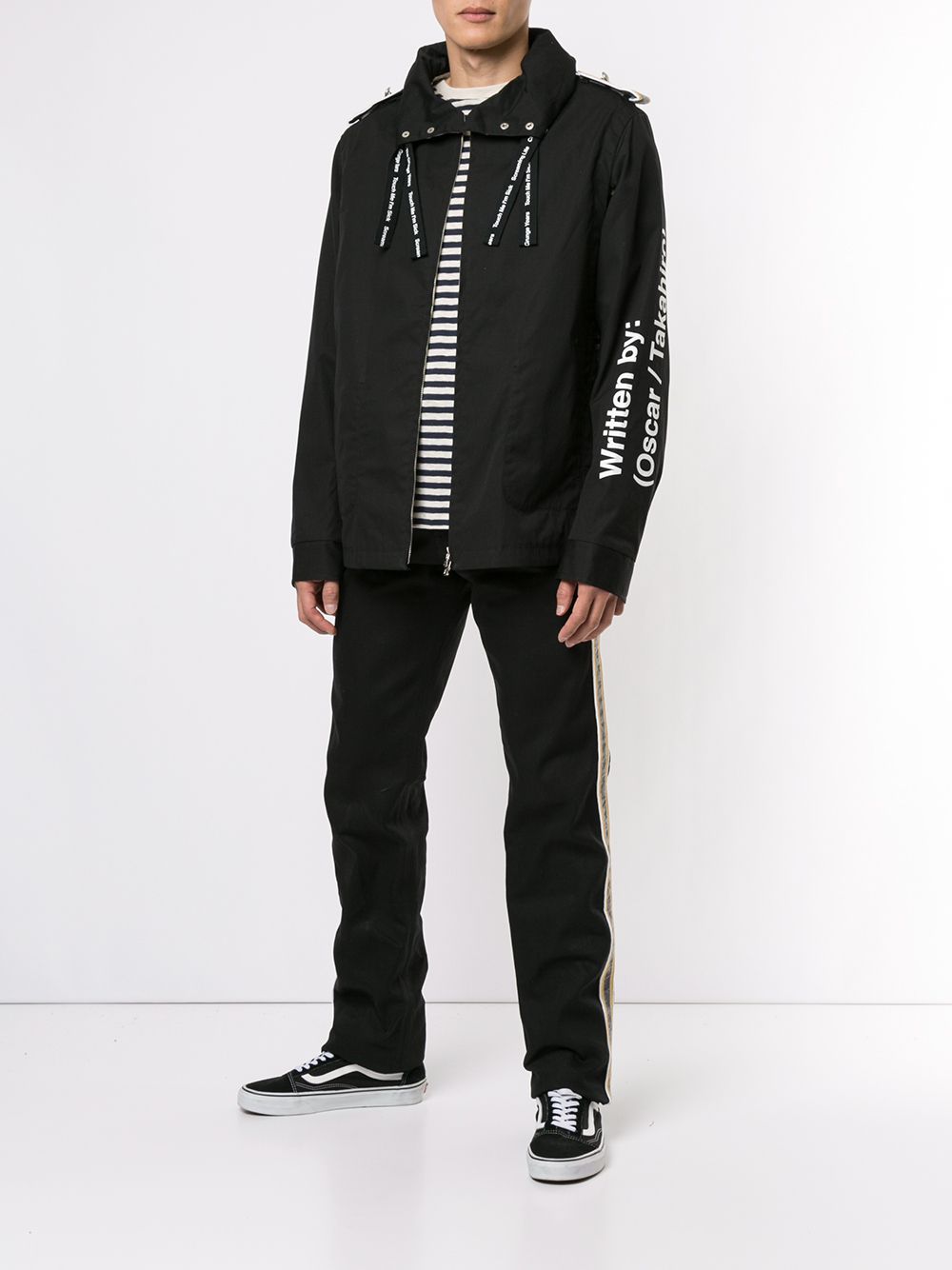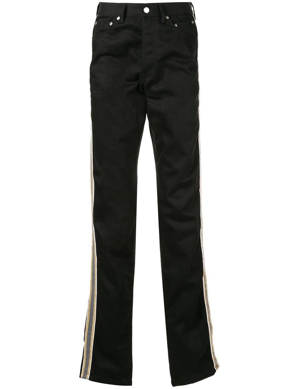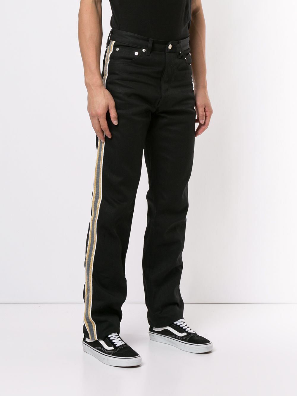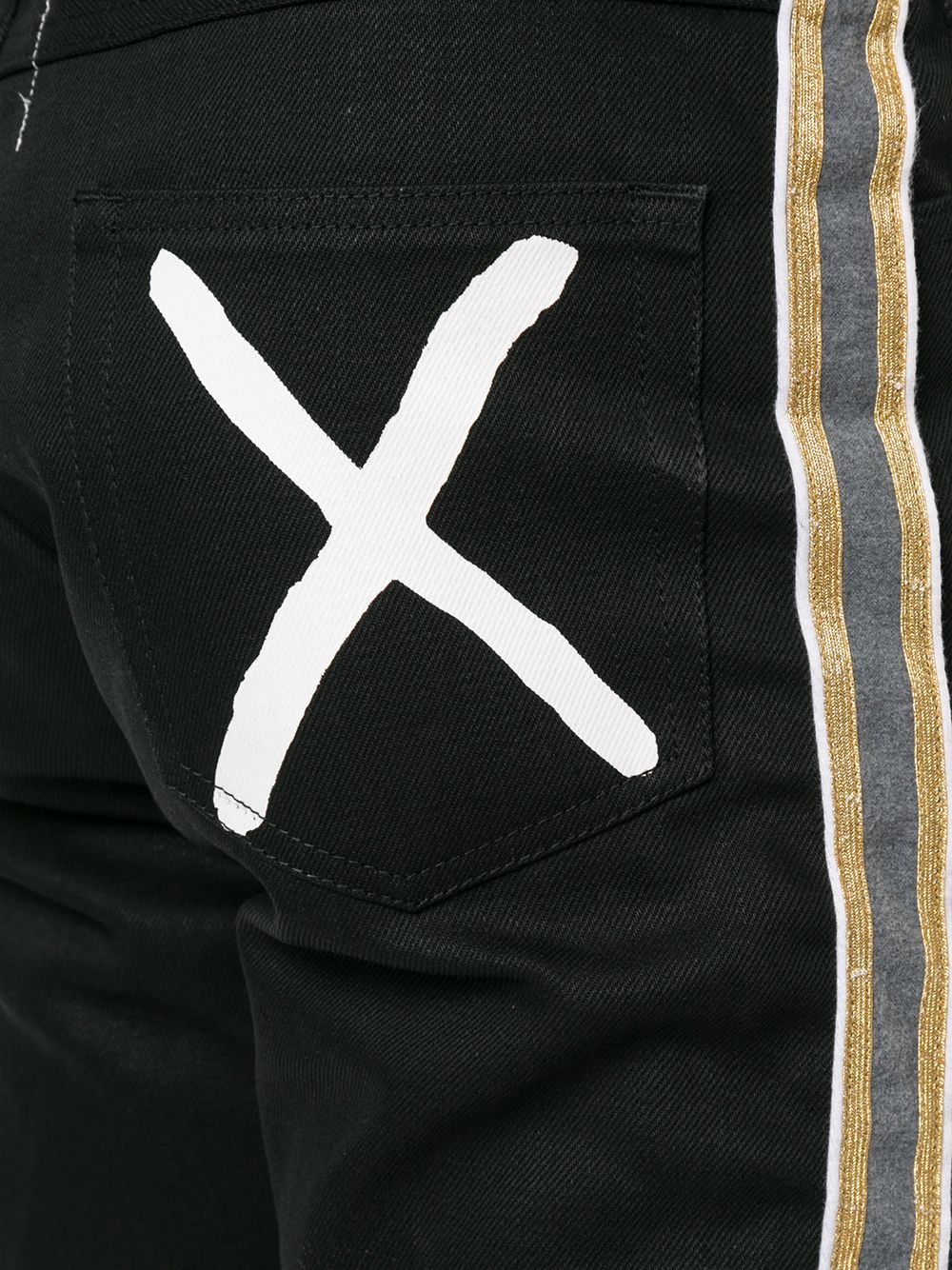 Black cotton straight leg jeans from Takahiromiyashita The Soloist featuring a front button fastening, belt loops, a five pocket design, a stripe detail to the side, X painted details to the back pockets and a regular length.