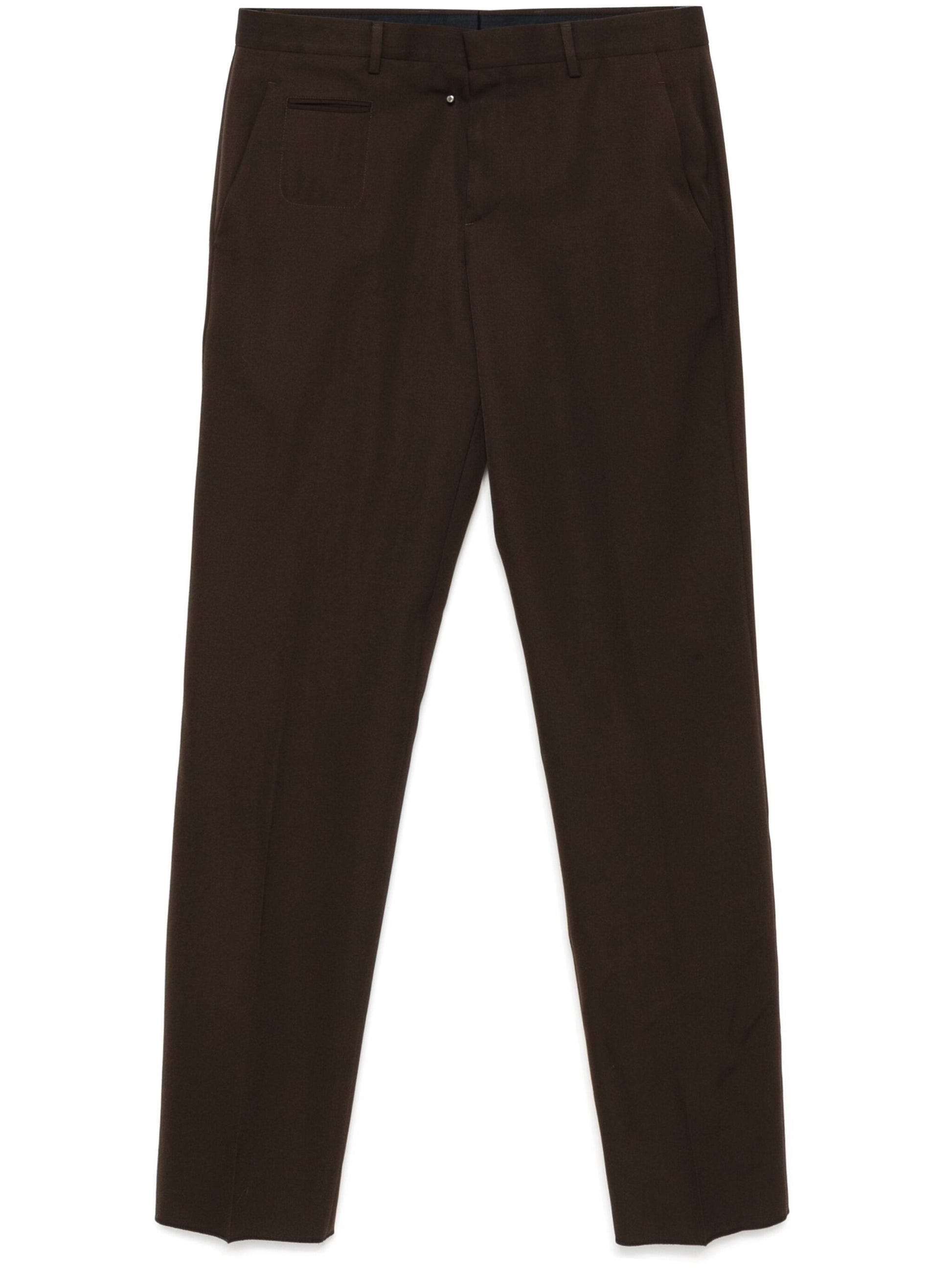 Expertly crafted from chocolate brown wool gabardine, our Straight-Leg Silm Trousers feature a concealed fly and button fastening, belt loops, and multiple pockets for convenience. The pressed crease and full-length straight leg slim cut offer a polished and sophisticated look.
