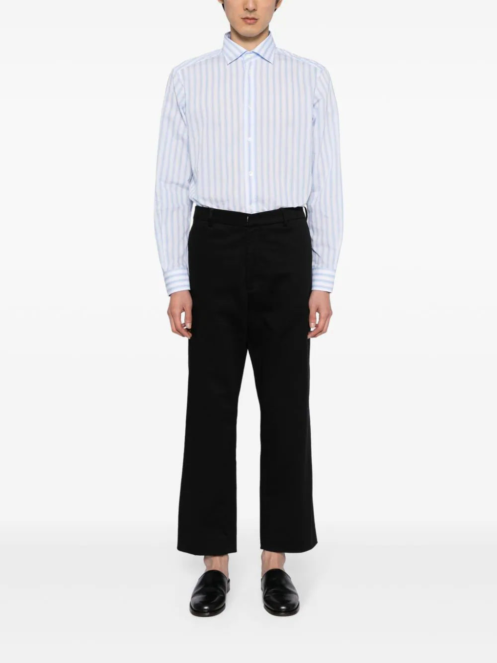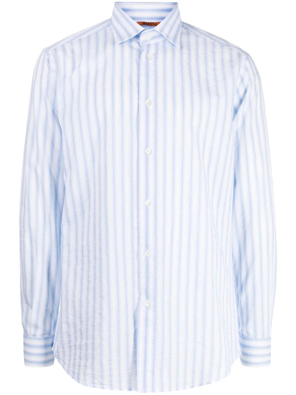 white blue cotton blend poplin texture vertical stripe pattern classic collar front button fastening long sleeves buttoned cuffs curved hem