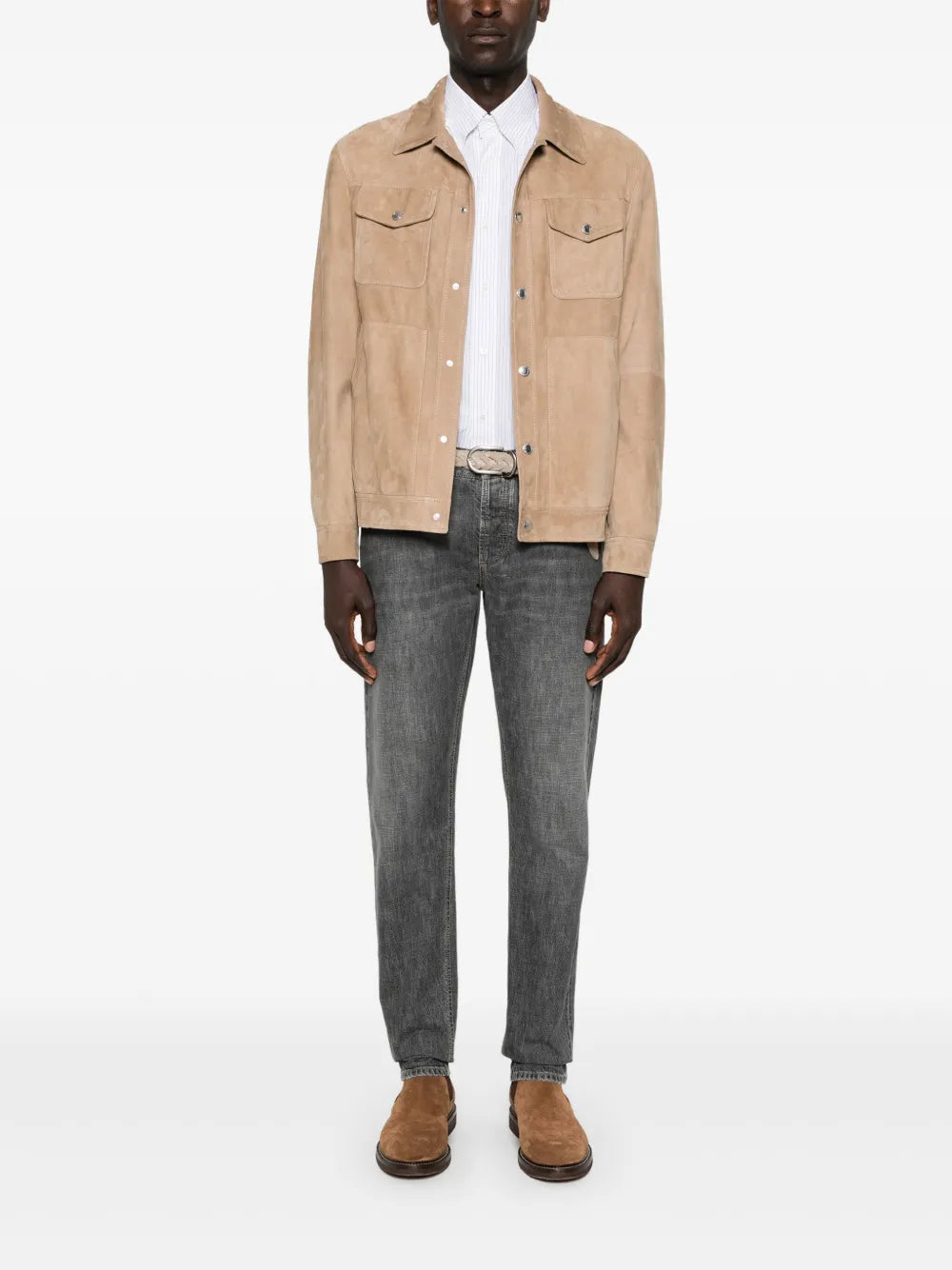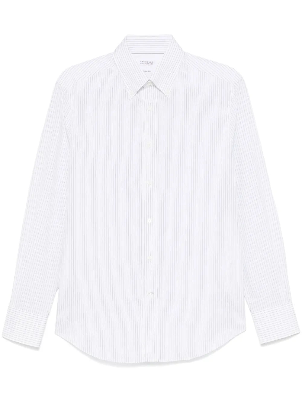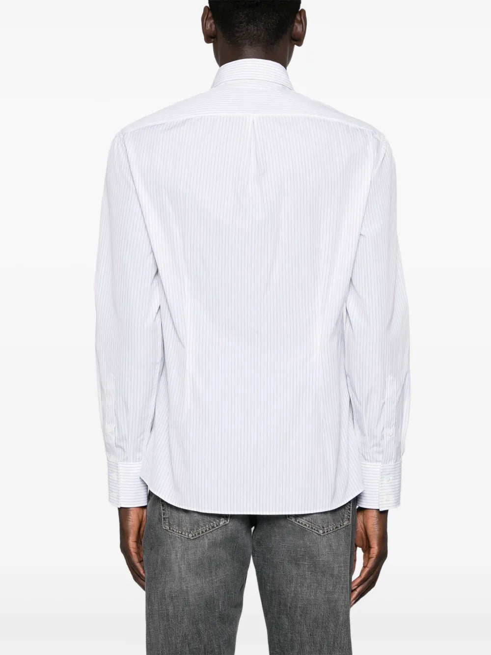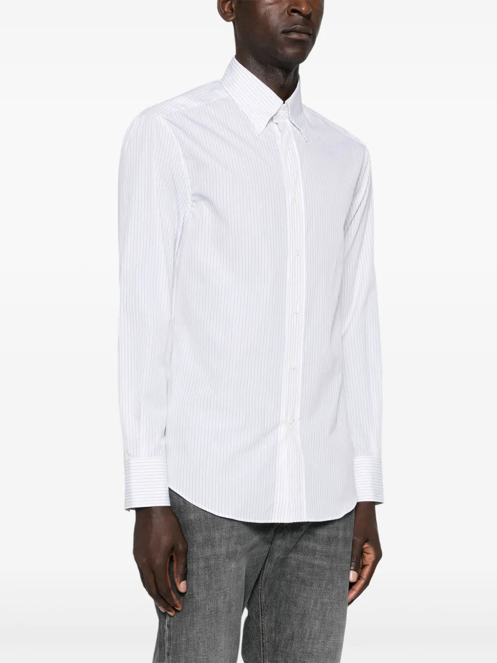 This Striped Shirt features a white and anthracite grey cotton poplin texture with a vertical stripe pattern. The front button fastening and button-down collar add a touch of sophistication, while the long sleeves with buttoned cuffs and curved hem provide a comfortable and stylish fit. Upgrade your wardrobe with this versatile and trendy shirt.