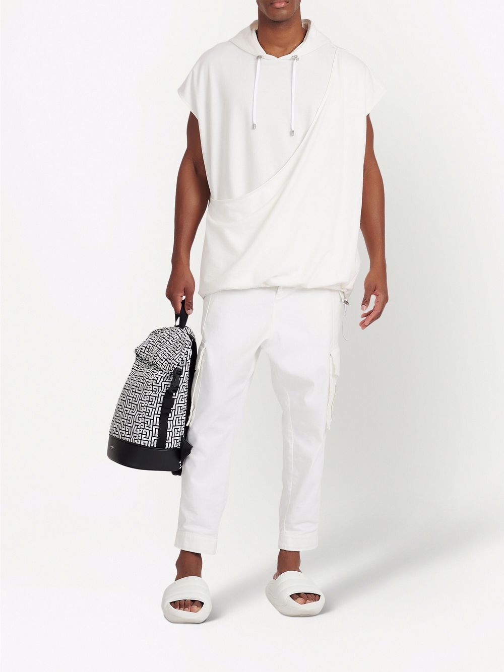 White cotton tapered leg cargo jeans from Balmain featuring tapered leg, two side cargo pockets, mid-rise, front button and zip fastening, two side flap pockets, two rear flap pockets and belt loops.