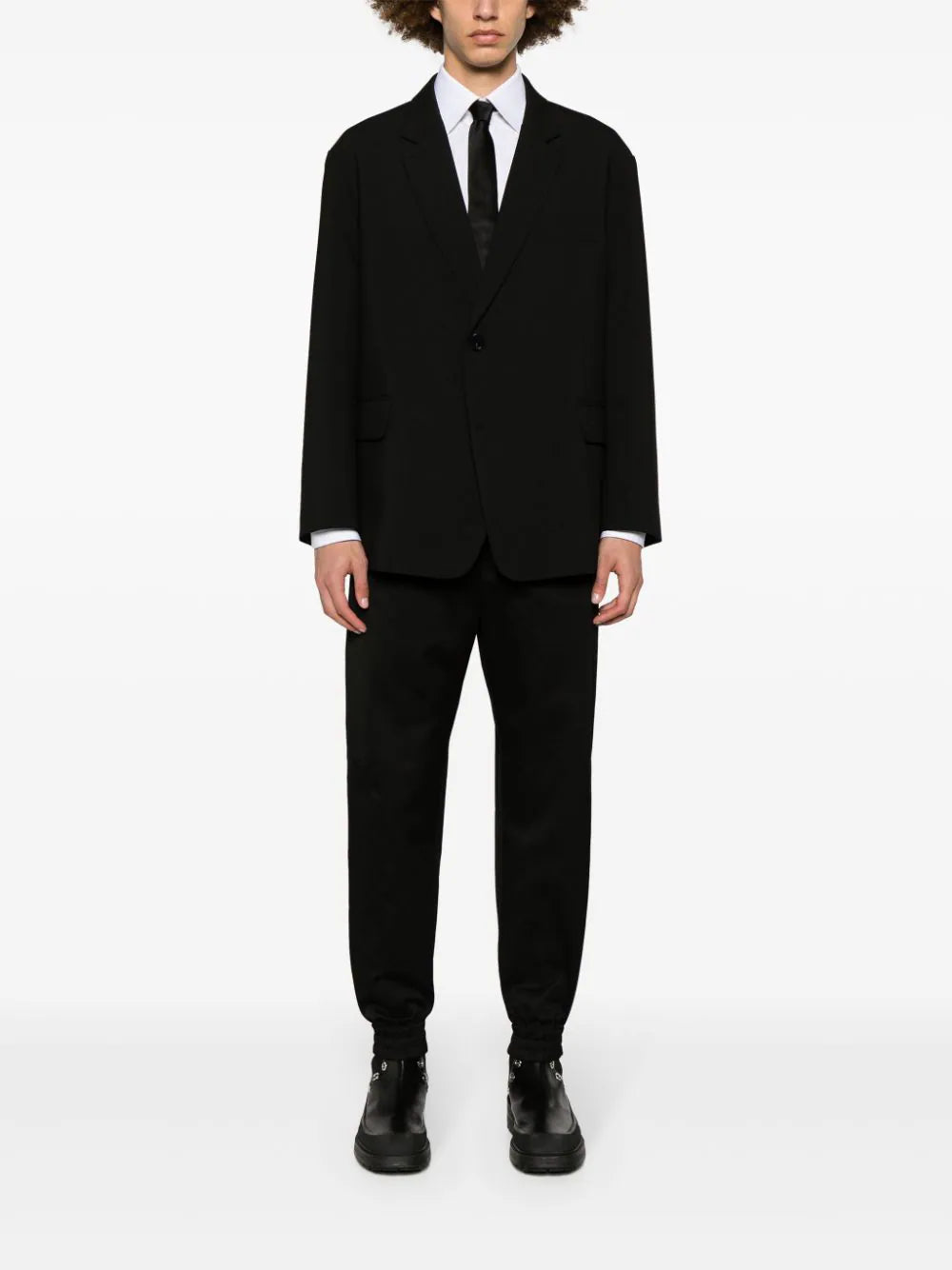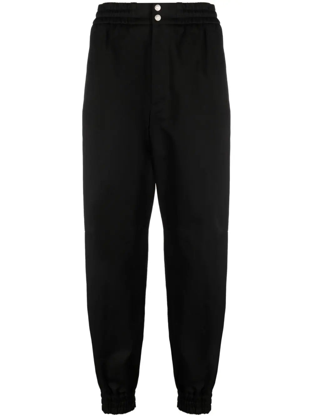 black cotton twill weave logo-engraved silver-tone hardware tapered leg mid-rise hook and zip fly fastening elasticated waistband internal drawstring fastening waist two side slit pockets two rear welt pockets elasticated ankles ankle zips
