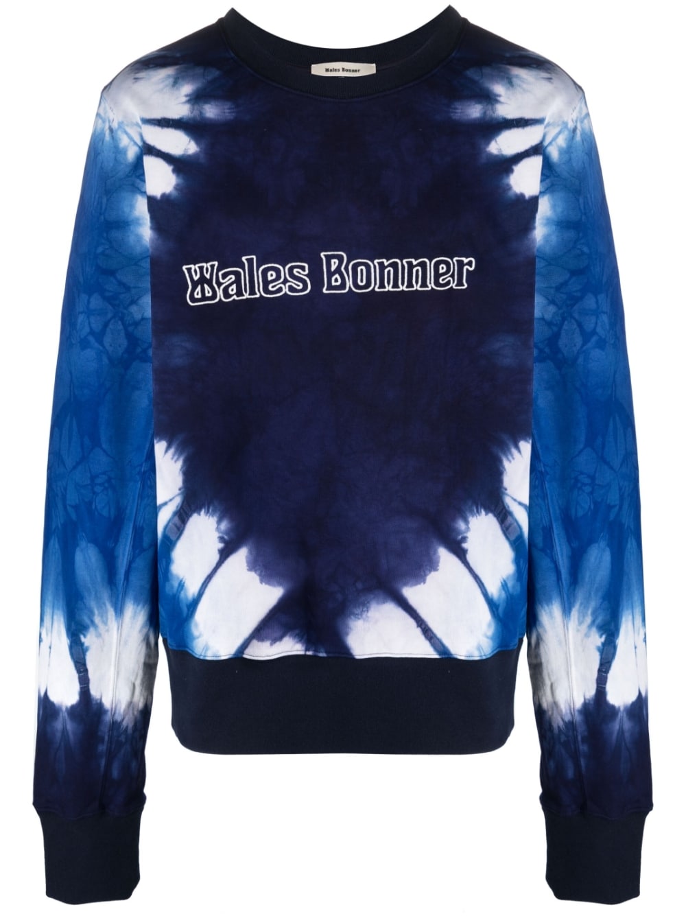 tie-dye logo-embroidered sweatshirt from Wales Bonner featuring cobalt blue, white, navy blue, cotton, jersey knit, tie-dye pattern, embroidered logo at the chest, crew neck, long sleeves and ribbed cuffs and hem.