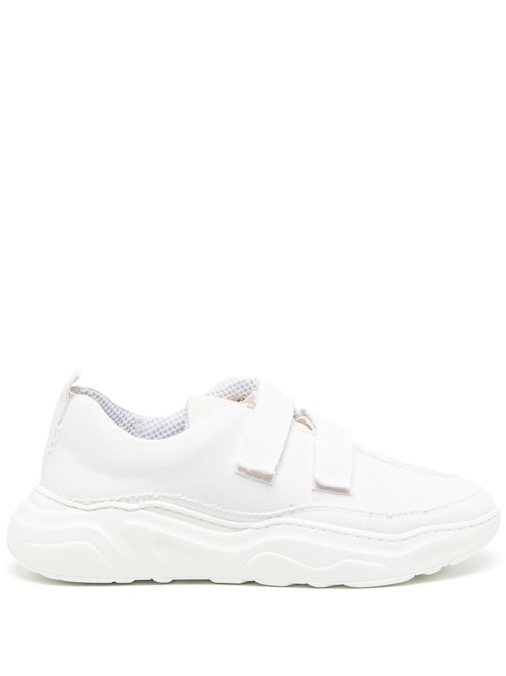 touch-strap low-top sneakers from PHILEO PARIS featuring white, canvas, suede, mesh panelling, pull-tab at the heel, front touch-strap fastening, round toe, branded footbed and chunky rubber sole.