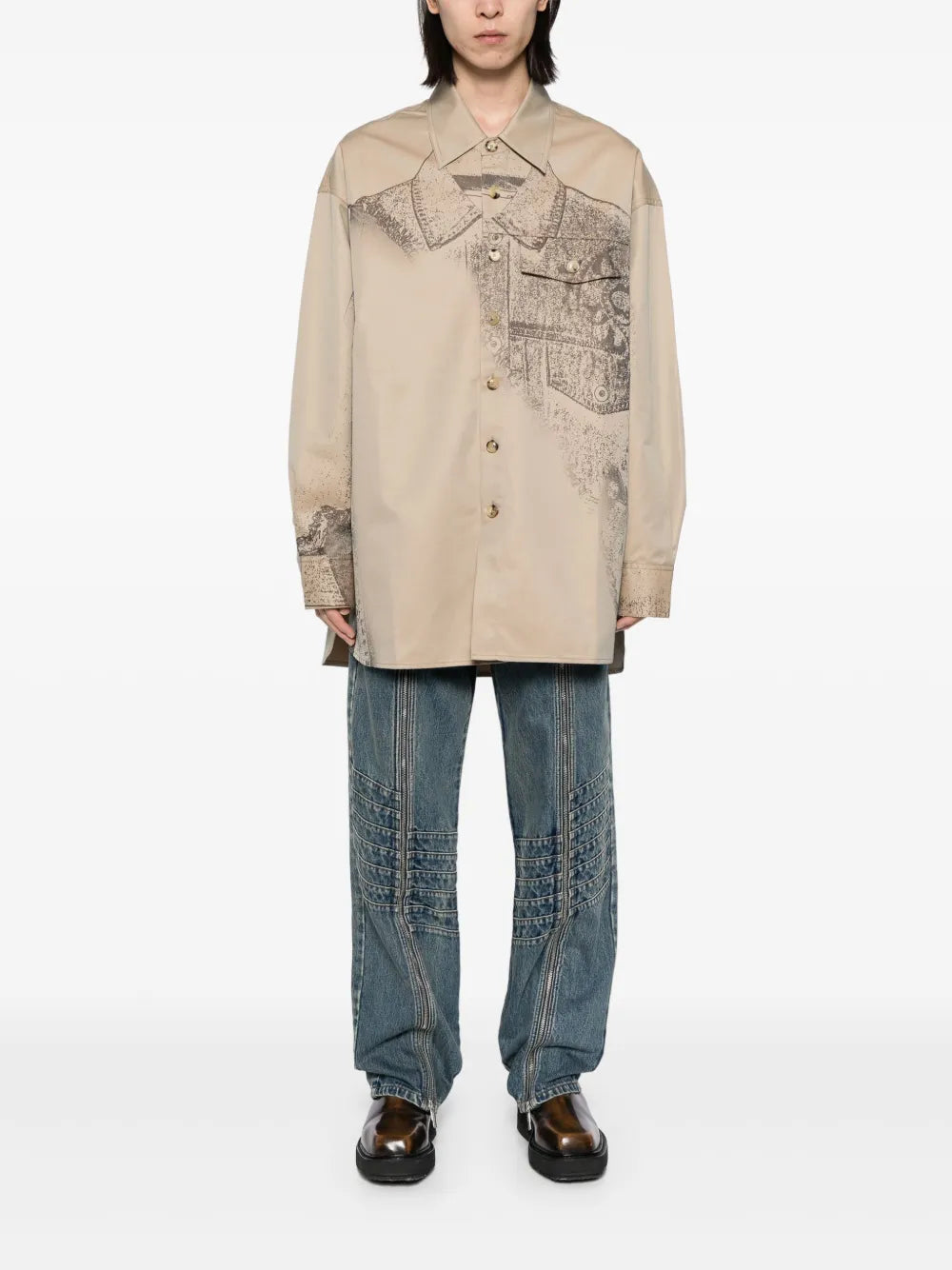 This khaki cotton blend shirt features an all-over graphic print, front button fastening, and spread collar for a relaxed yet stylish look. The chest flap pocket adds functionality while the side slits and curved hem provide a comfortable fit. Elevate your wardrobe with this versatile and trendy Trompe Loeil Shirt.
