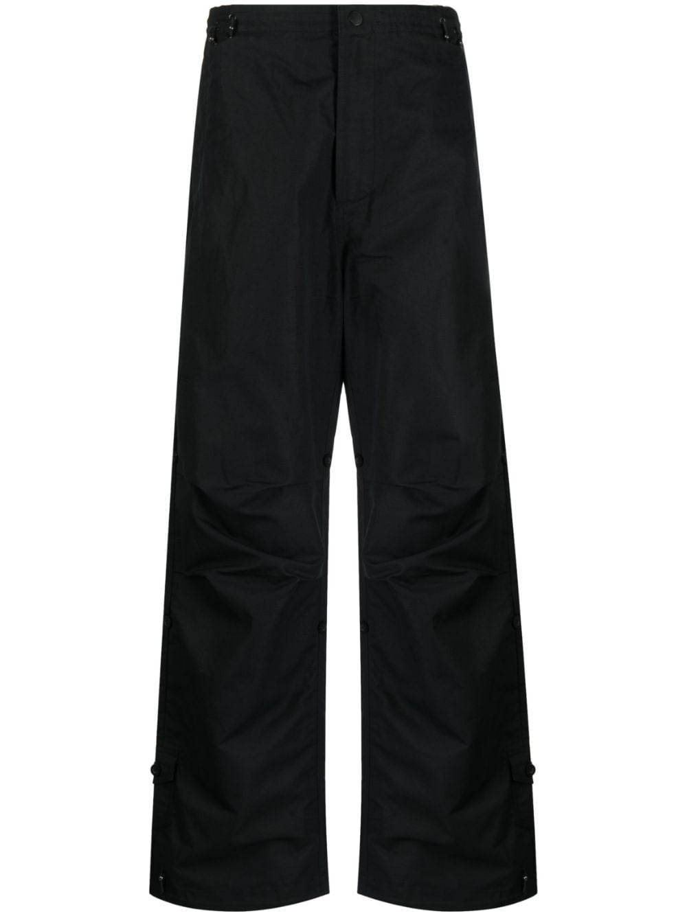 Ventile loose-fit Snopants trousers from MAHARISHI featuring black, organic cotton blend, front button and zip fastening, adjustable sliding fastening, two diagonal pockets to the sides, internal pocket, rear flap pocket and detachable legs.