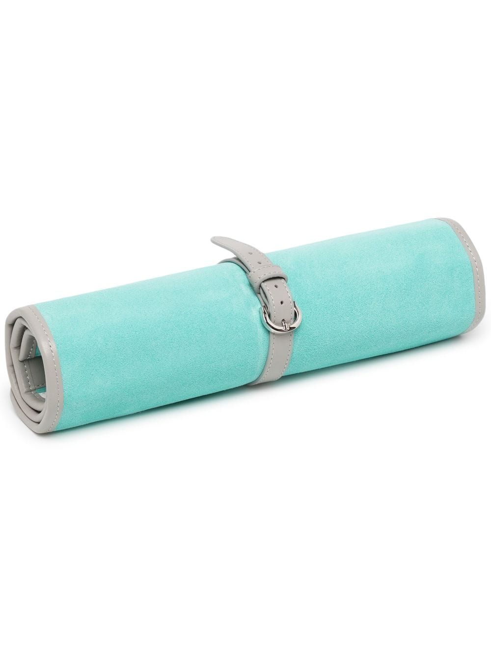 Victor travel backgammon set from Hector Saxe featuring mint green, grey, white, leather, buckle fastening and internal pocket.