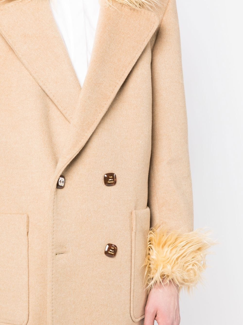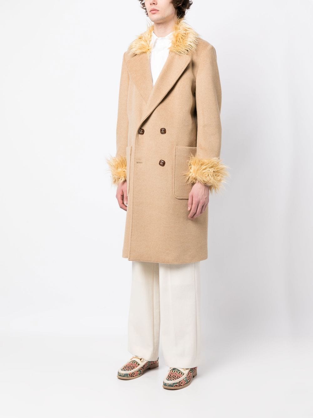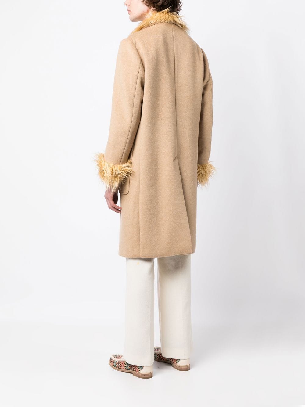 wool double-breasted coat from Late Checkout featuring camel brown, faux-fur trim, notched collar, double-breasted button fastening, long sleeves, two front patch pockets, straight hem and wool.