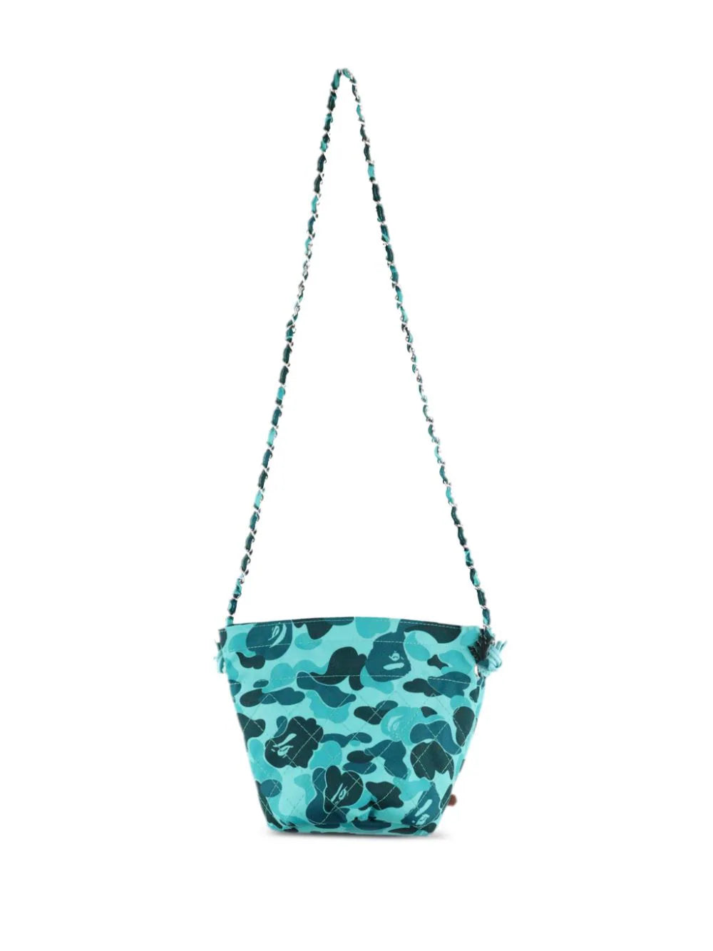 turquoise blue-green/navy blue camouflage print diamond pattern silver-tone hardware bucket body single shoulder strap top drawstring fastening main compartment
