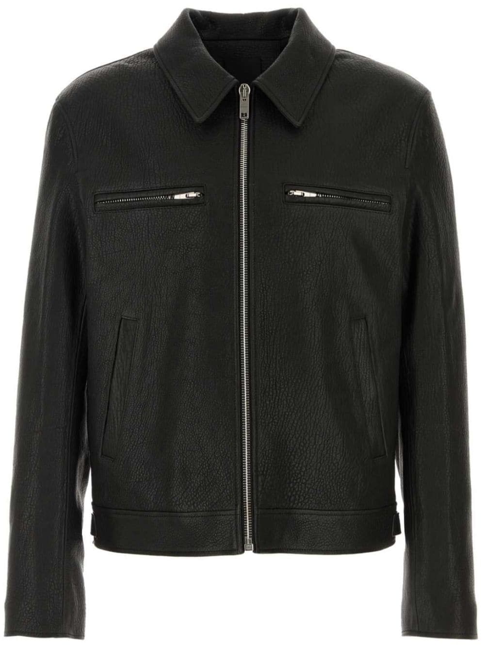 black lambskin pebbled texture classic collar front zip fastening long sleeves cuff zips two zip-fastening chest pockets two side welt pockets adjustable waist strap straight hem full lining