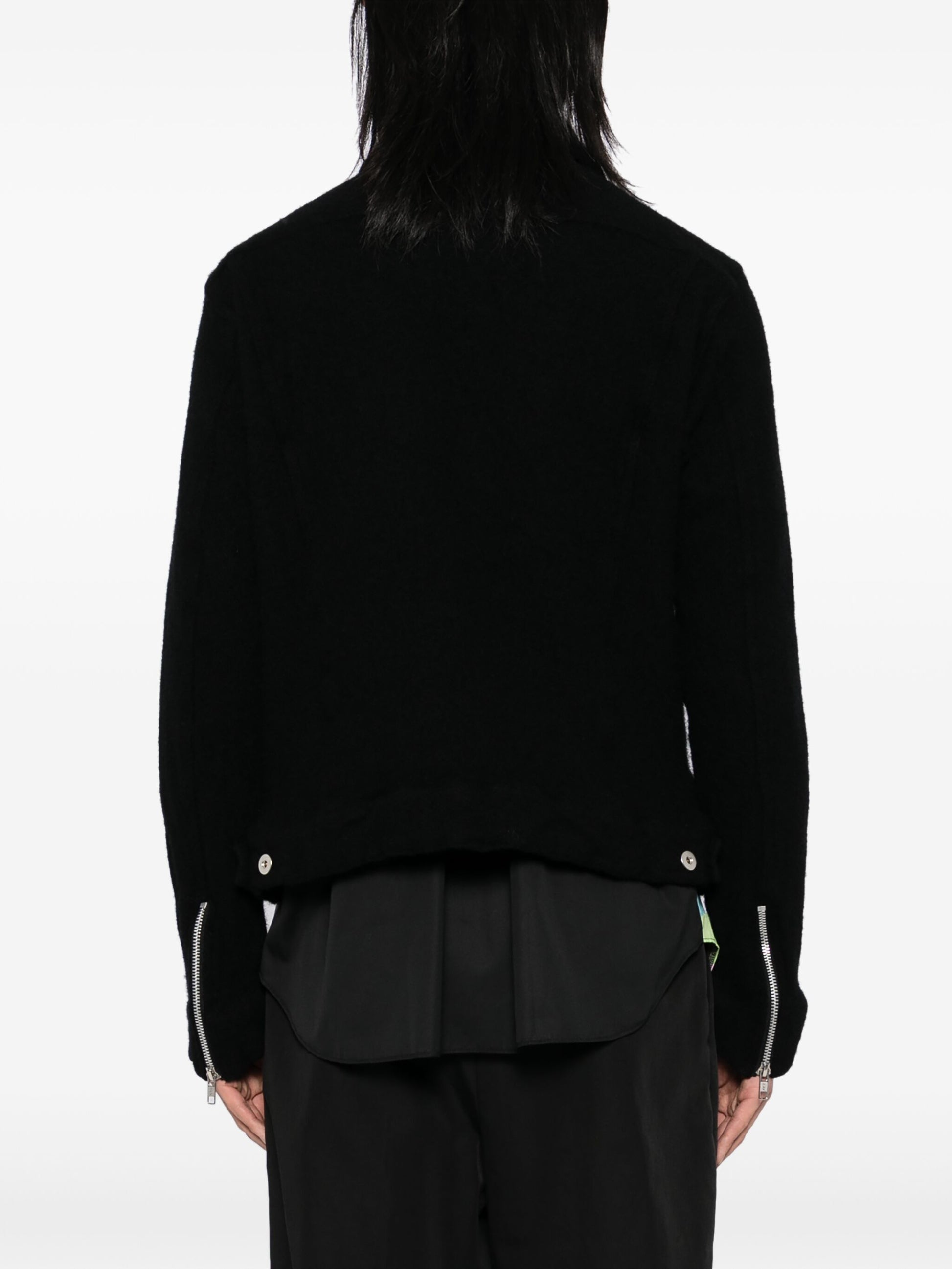 This black Zip-Up Jacket features two button-fastening chest pockets, cuff zips, and long sleeves for a sleek and functional look. Made with high-quality materials, this jacket offers both style and practicality. Keep your belongings secure and your arms warm with this versatile and stylish piece.